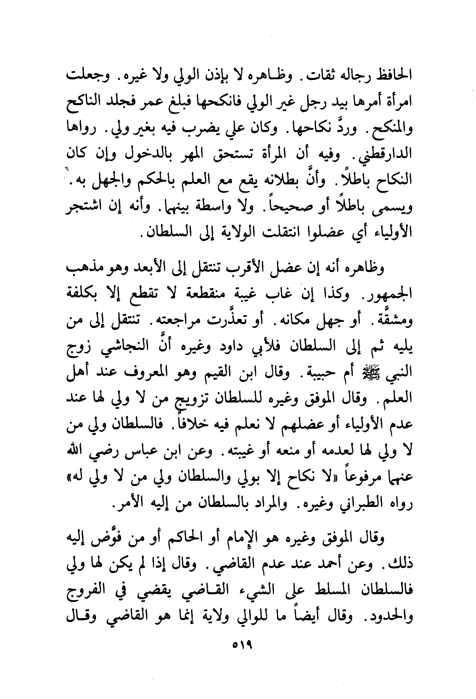وظاهره أنه إن عضل الأقرب تنتقل إلى الأبعد وهو مذهب الجمهور. وكذا إن غاب غيبة منقطعة لا تقطع إلا بكلفة ومشقة أو جهل مكانه. أو تعذرت مراجعته. تنتقل إلى من يليه ثم إلى السلطان فلأبي داود وغيره أن النجاشي زوج النبي - صلى الله عليه وسلم - أم حبيبة وقال ابن القيم وهو المعروف عند أهل العلم. وقال الموفق وغيره للسلطان تزويج من لا ولي لها عند عدم الأولياء أو عضلهم لا نعلم فيه خلافًا. فالسلطان ولي من لا ولي لها لعدمه أو منعه أو غيبته. وعن ابن عباس -رضي الله عنهما- مرفوعًا "لا نكاح إلا بولي والسلطان ولي من لا ولي له".