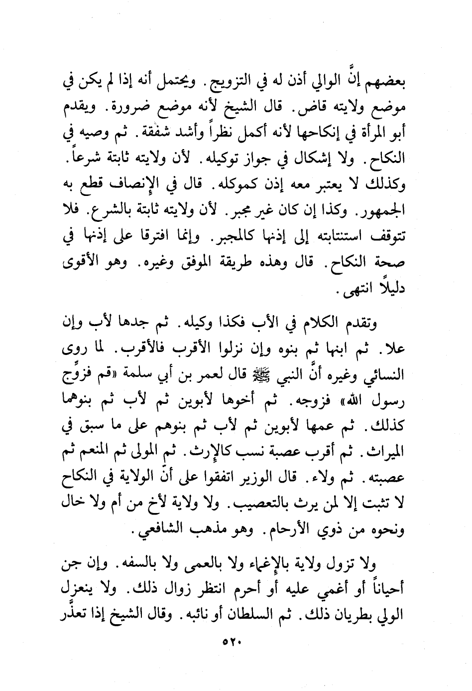 وتقدم الكلام في الأب فكذا وكيله. ثم جدها لأب وإن علا. ثم ابنها ثم بنوه وإن نزلوا الأقرب فالأقرب. لما روى النسائي وغيره أن النبي - صلى الله عليه وسلم - قال لعمر بن أبي سلمة "قم فزوج رسول الله" فزوجه. ثم أخوها لأبوين ثم لأب ثم بنوهما كذلك. ثم عمها لأبوين ثم لأب ثم بنوهم على ما سبق في الميراث. ثم أقرب عصبة نسب كالإرث ثم المولى ثم المنعم ثم عصبته ثم ولاء. قال الوزير اتفقوا على أن الولاية في النكاح لا تثبت إلا لمن يرث بالتعصيب ولا ولاية لأخ من أم ولا خال ونحوه من ذوي الأرحام وهو مذهب الشافعي.