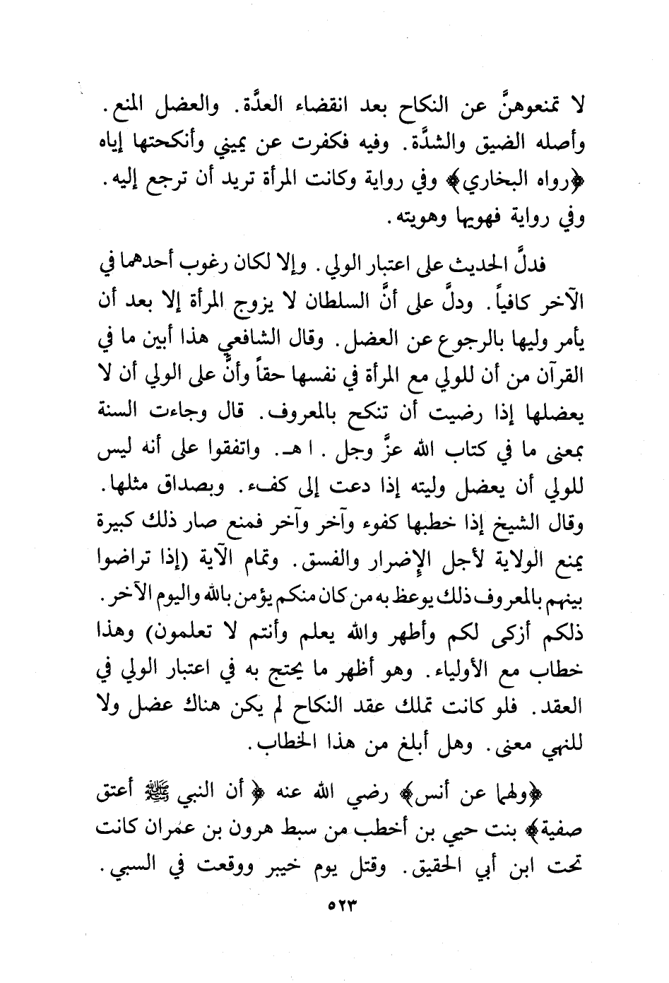 فدل الحديث على اعتبار الولي. وإلا لكان رغوب أحدهما في الآخر كافيًا. ودل على أن السلطان لا يزوج المرأة إلا بعد أن يأمر وليها بالرجوع عن العضل. وقال الشافعي هذا أبين ما في القرآن من أن للولي مع المرأة في نفسها حقًا وأن على الولي أن لا يعضلها إذا رضيت أن تنكح بالمعروف. قال وجاءت السنة بمعنى ما في كتاب الله عز وجل. اهـ. واتفقوا على أنه ليس للولي أن يعضل وليته إذا دعت إلى كفء. وبصداق مثلها.