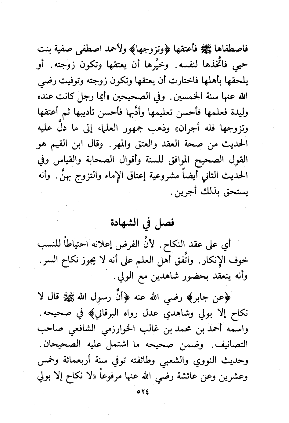 فاصطفاها - صلى الله عليه وسلم - فأعتقها (وتزوجها) ولأحمد اصطفى صفية بنت حي فاتخذها لنفسه. وخيرها أن يعتقها وتكون زوجته أو يلحقها بأهلها فاختارت أن يعتقها وتكون زوجته وتوفيت رضي الله عنها سنة الخمسين. وفي الصحيحين "أيما رجل كانت عندة وليدة فعلمها فأحسن تعليمها وأدبها فأحسن تأديبها ثم أعتقها وتزوجها فله أجران" وذهب جمهور العلماء إلى ما دل عليه الحديث من صحة العقد والعتق والمهر. وقال ابن القيم هو القول الصحيح الموافق للسنة وأقوال الصحابة والقياس وفي الحديث الثاني أيضًا مشروعية إعتاق الإماء والتزوج بهن وأنه يستحق بذلك أجرين.