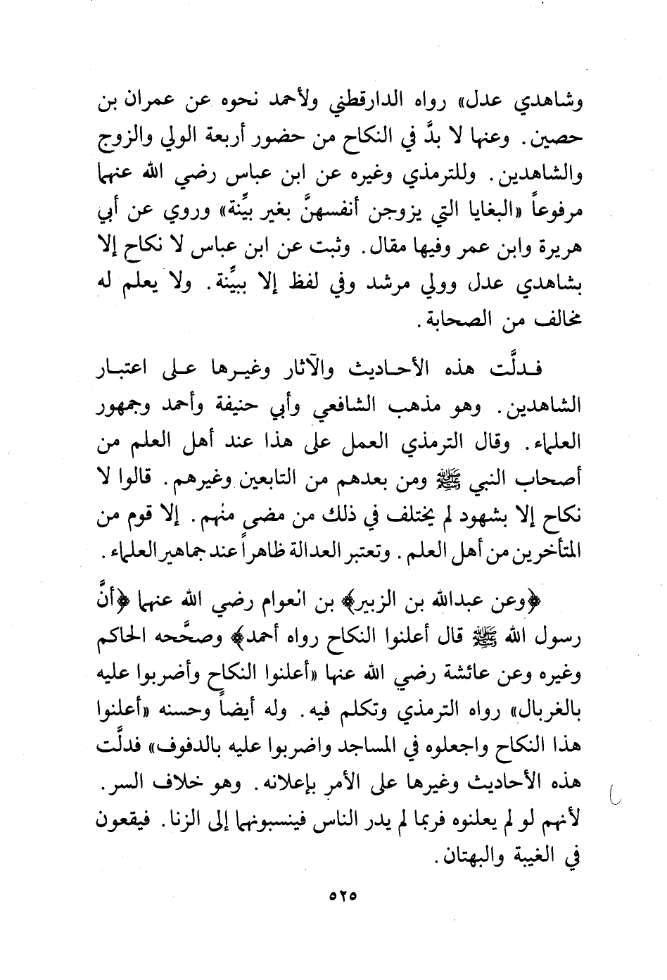 فدلت هذه الأحاديث والآثار وغيرها على اعتبار الشاهدين. وهو مذهب الشافعي وأبي حنيفة وأحمد وجمهور العلماء. وقال الترمذي العمل على هذا عند أهل العلم من أصحاب النبي - صلى الله عليه وسلم - ومن بعدهم من التابعين وغيرهم. قالوا لا نكاح إلا بشهود لم يختلف في ذلك من مضى منهم. إلا قوم من المتأخرين من أهل العلم. وتعتبر العدالة ظاهرًا عند جماهير العلماء.
