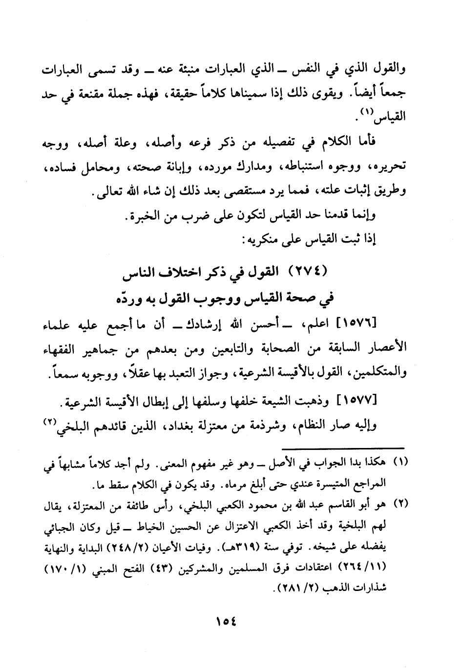 1576 - اعْلَم، - أحسن الله إرشادك - أَن مَا أجمع عَلَيْهِ عُلَمَاء الْأَعْصَار السَّابِقَة من الصَّحَابَة وَالتَّابِعِينَ وَمن بعدهمْ من جَمَاهِير الْفُقَهَاء والمتكلمين، القَوْل بالأقيسة الشَّرْعِيَّة، وَجَوَاز التَّعَبُّد بهَا عقلا، ووجوبه سمعا.