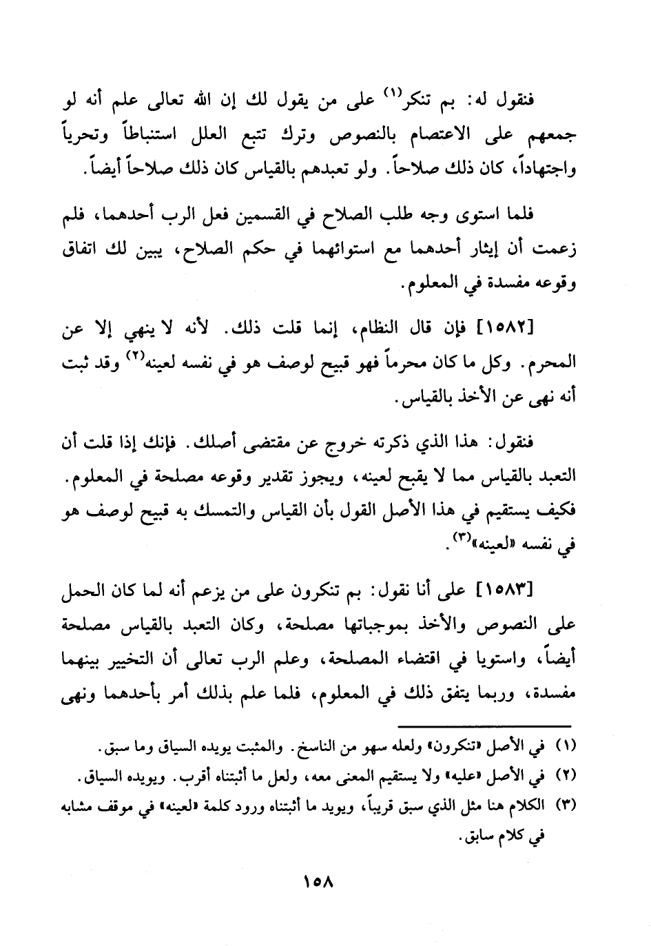 1583 - على أَنا نقُول: بِمَ تنكرون على من يزْعم أَنه لما كَانَ الْحمل على النُّصُوص وَالْأَخْذ بموجباتها مصلحَة، وَكَانَ التَّعَبُّد بِالْقِيَاسِ مصلحَة أَيْضا، واستويا فِي اقْتِضَاء الْمصلحَة، وَعلم الرب تَعَالَى أَن التَّخْيِير بَينهمَا مفْسدَة، وَرُبمَا يتَّفق ذَلِك فِي الْمَعْلُوم، فَلَمَّا علم بذلك أَمر بِأَحَدِهِمَا وَنهى