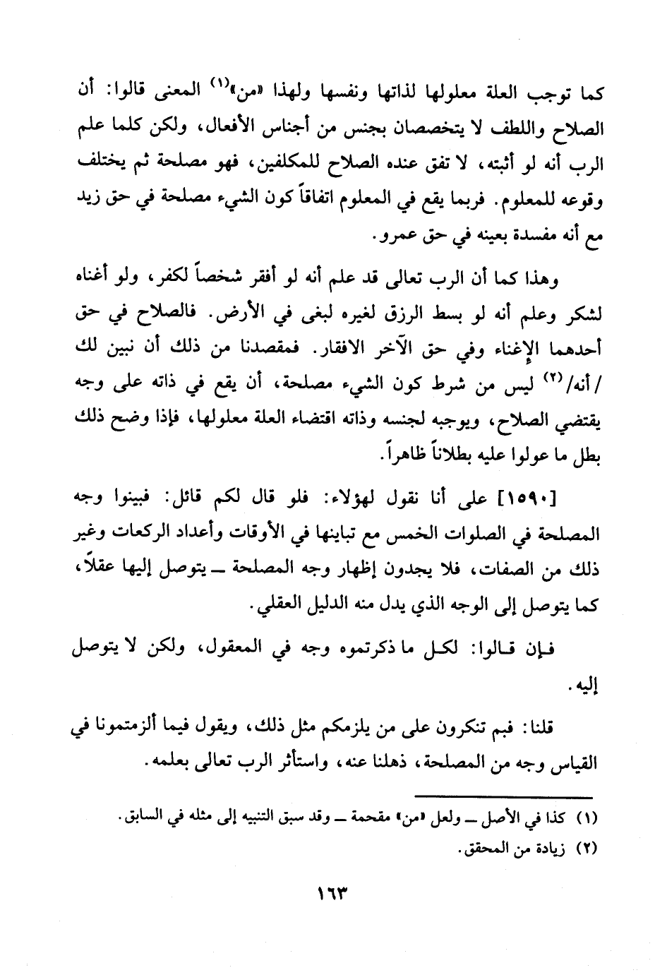 1590 - على أَنا نقُول لهَؤُلَاء: فَلَو قَالَ لكم قَائِل: فبينوا وَجه الْمصلحَة فِي الصَّلَوَات الْخمس مَعَ تباينها فِي الْأَوْقَات وأعداد الرَّكْعَات وَغير ذَلِك من الصِّفَات، فَلَا يَجدونَ إِظْهَار وَجه الْمصلحَة - يتَوَصَّل إِلَيْهَا عقلا، كَمَا يتَوَصَّل إِلَى الْوَجْه الَّذِي يدل مِنْهُ الدَّلِيل الْعقلِيّ.