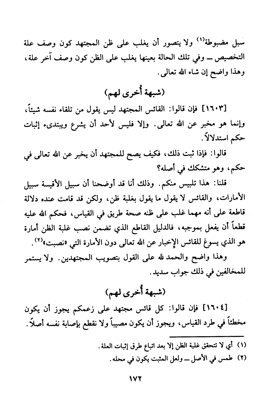 1604 - فَإِن قَالُوا: كل قائس مُجْتَهد على زعمكم يجوز أَن يكون مخطئاً فِي طرد الْقيَاس، وَيجوز أَن يكون مصيباً وَلَا نقطع بِإِصَابَة نَفسه أصلا.