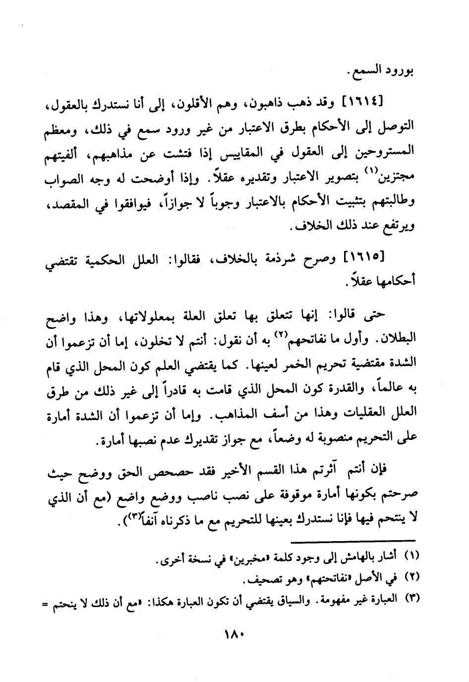 1614 - وَقد ذهب ذاهبون، وهم الأقلون، إِلَى أَنا نستدرك بالعقول، التَّوَصُّل إِلَى الْأَحْكَام بطرق الِاعْتِبَار من غير وُرُود سمع فِي ذَلِك، ومعظم المستروحين إِلَى الْعُقُول فِي المقاييس إِذا فتشت عَن مذاهبهم، ألفيتهم مجتزين بتصوير الِاعْتِبَار وَتَقْدِيره عقلا. وَإِذا أوضحت لَهُ وَجه الصَّوَاب وطالبتهم بتثبيت الْأَحْكَام بِالِاعْتِبَارِ وجوبا لَا جَوَازًا، فيوافقوا فِي الْمَقْصد، ويرتفع عِنْد ذَلِك الْخلاف.