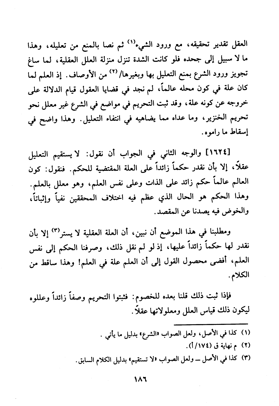 1624 - وَالْوَجْه الثَّانِي فِي الْجَواب أَن نقُول: لَا يَسْتَقِيم التَّعْلِيل عقلا، إِلَّا بِأَن نقدر حكما زَائِدا على الْعلَّة الْمُقْتَضِيَة للْحكم. فَنَقُول: كَون الْعَالم عَالما حكم زَائِد على الذَّات وعَلى نفس الْعلم، وَهُوَ مُعَلل بِالْعلمِ. وَهَذَا الحكم هُوَ الْحَال الَّذِي عظم فِيهِ اخْتِلَاف الْمُحَقِّقين نفيا وإثباتاً، والخوض فِيهِ يصدنا عَن الْمَقْصد.