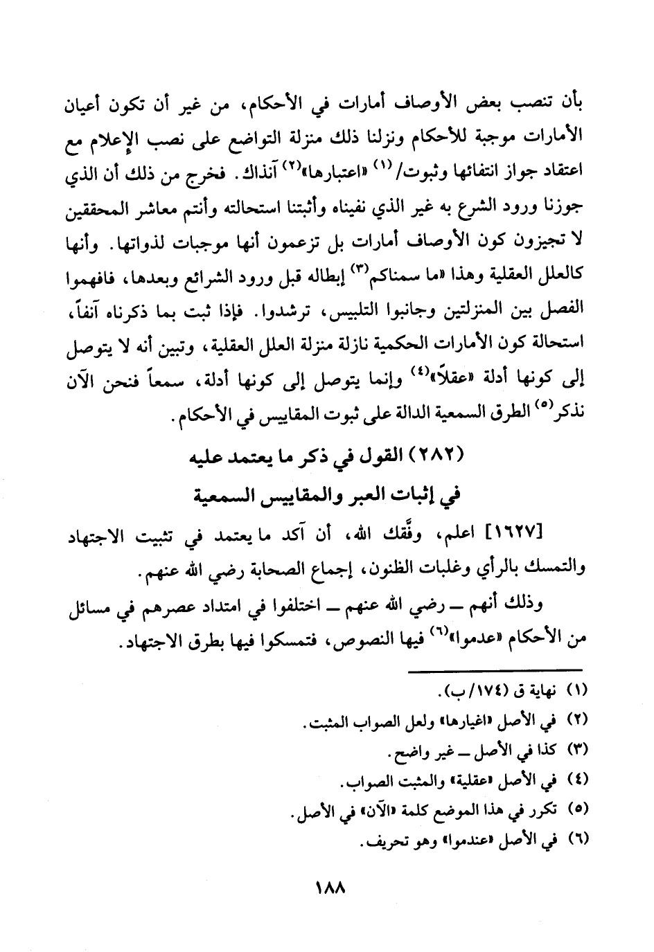 بِأَن تنصب بعض الْأَوْصَاف أَمَارَات فِي الْأَحْكَام، من غير أَن تكون أَعْيَان الأمارات مُوجبَة للْأَحْكَام ونزلنا ذَلِك منزلَة التَّوَاضُع على نصب الْإِعْلَام مَعَ اعْتِقَاد جَوَاز انتفائها وَثُبُوت / " اعْتِبَارهَا " آنذاك. فَخرج من ذَلِك أَن الَّذِي جَوَّزنَا وُرُود الشَّرْع بِهِ غير الَّذِي نفيناه وأثبتنا استحالته وَأَنْتُم معاشر الْمُحَقِّقين لَا تجيزون كَون الْأَوْصَاف أَمَارَات بل تَزْعُمُونَ أَنَّهَا مُوجبَات لذواتها. وَأَنَّهَا كالعلل الْعَقْلِيَّة وَهَذَا " مَا سمناكم " إِبْطَاله قبل وُرُود الشَّرَائِع وَبعدهَا، فافهموا الْفَصْل بَين المنزلتين وجانبوا التلبيس، ترشدوا. فَإِذا ثَبت بِمَا ذَكرْنَاهُ آنِفا، اسْتِحَالَة كَون الأمارات الْحكمِيَّة نازلة منزلَة الْعِلَل الْعَقْلِيَّة، وَتبين أَنه لَا يتَوَصَّل إِلَى كَونهَا أَدِلَّة " عقلا " وَإِنَّمَا يتَوَصَّل إِلَى كَونهَا أَدِلَّة، سمعا فَنحْن الْآن نذْكر الطّرق السمعية الدَّالَّة على ثُبُوت المقاييس فِي الْأَحْكَام.