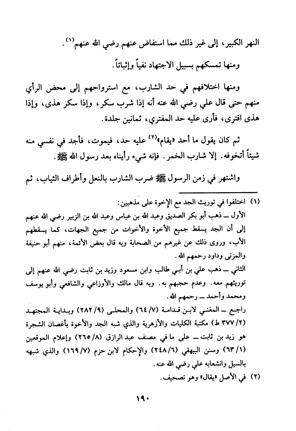 وَمِنْهَا اخْتلَافهمْ فِي حد الشَّارِب، مَعَ استرواحهم إِلَى مَحْض الرَّأْي مِنْهُم حَتَّى قَالَ عَليّ رَضِي الله عَنهُ أَنه إِذا شرب سكر، وَإِذا سكر هذى، وَإِذا هذى افترى، فَأرى عَلَيْهِ حد المفتري، ثَمَانِينَ جلدَة.