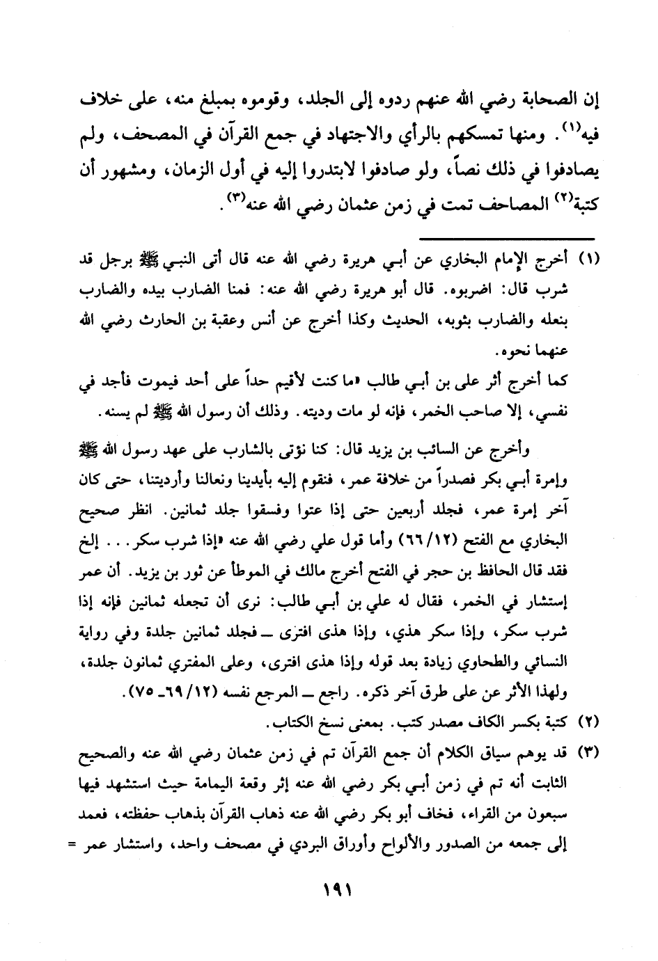 إِن الصَّحَابَة رَضِي الله عَنْهُم ردُّوهُ إِلَى الْجلد، وقوموه بمبلغ مِنْهُ، على خلاف فِيهِ. وَمِنْهَا تمسكهم بِالرَّأْيِ وَالِاجْتِهَاد فِي جمع الْقُرْآن فِي الْمُصحف، وَلم يصادفوا فِي ذَلِك نصا، وَلَو صادفوا لابتدروا إِلَيْهِ فِي أول الزَّمَان، ومشهور أَن كتبة الْمَصَاحِف تمت فِي زمن عُثْمَان رَضِي الله عَنهُ.