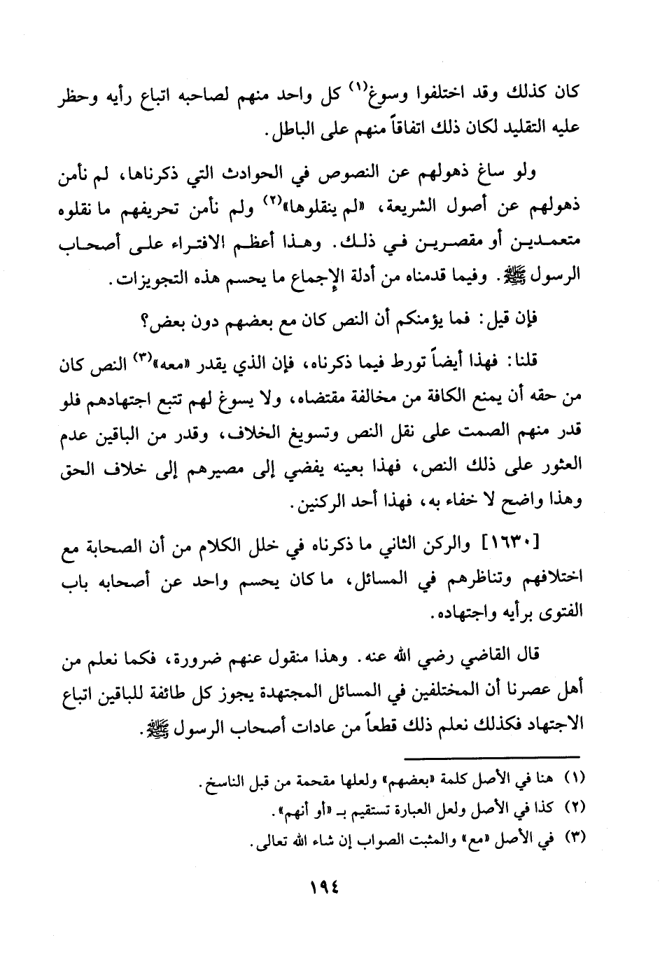 1630 - والركن الثَّانِي مَا ذَكرْنَاهُ فِي خلل الْكَلَام من أَن الصَّحَابَة مَعَ اخْتلَافهمْ وتناظرهم فِي الْمسَائِل، مَا كَانَ يحسم وَاحِد عَن أَصْحَابه بَاب الْفَتْوَى بِرَأْيهِ واجتهاده.