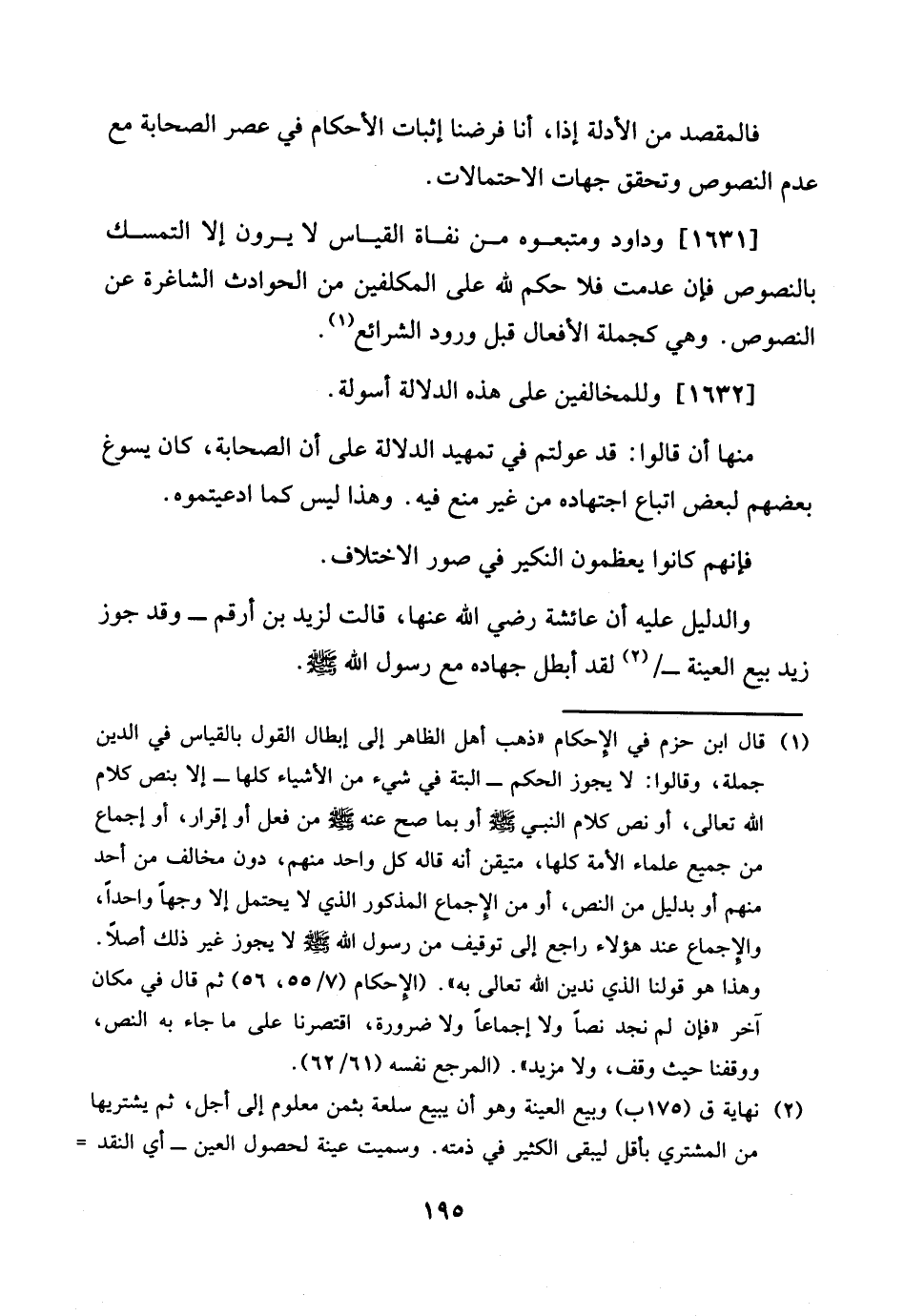 1631 - وَدَاوُد ومتبعوه من نفاة الْقيَاس لَا يرَوْنَ إِلَّا التَّمَسُّك بالنصوص فَإِن عدمت فَلَا حكم لله على الْمُكَلّفين من الْحَوَادِث الشاغرة عَن النُّصُوص. وَهِي كجملة الْأَفْعَال قبل وُرُود الشَّرَائِع.