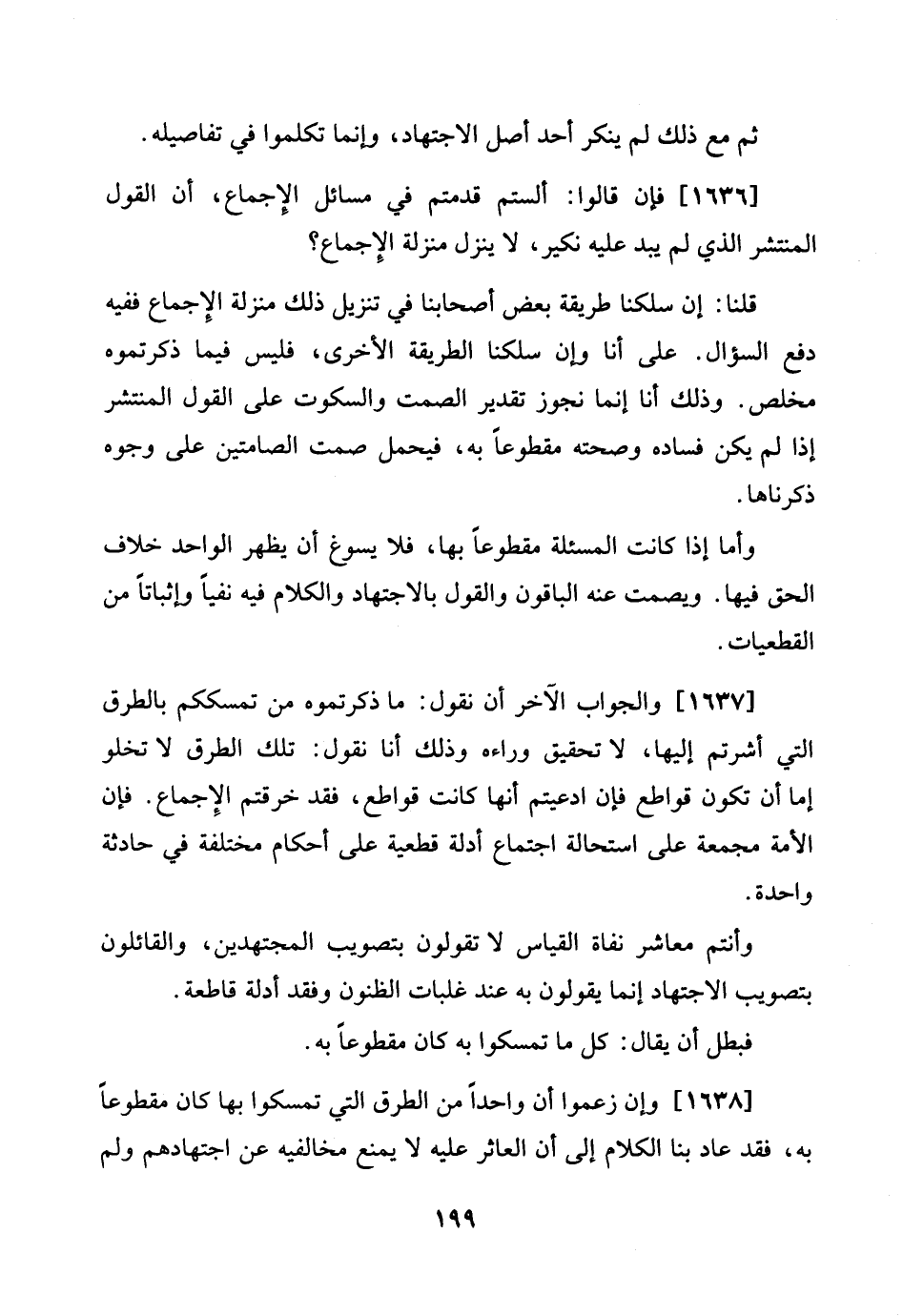 1637 - وَالْجَوَاب الآخر أَن نقُول: مَا ذكرتموه من تمسككم بالطرق الَّتِي أشرتم إِلَيْهَا، لَا تَحْقِيق وَرَاءه وَذَلِكَ أَن نقُول: تِلْكَ الطّرق لَا تَخْلُو إِمَّا أَن تكون قواطع فَإِن ادعيتم أَنَّهَا كَانَت قواطع، فقد خرقتم الْإِجْمَاع. فَإِن الْأمة مجمعة على اسْتِحَالَة اجْتِمَاع أَدِلَّة قَطْعِيَّة على أَحْكَام مُخْتَلفَة فِي حَادِثَة وَاحِدَة.