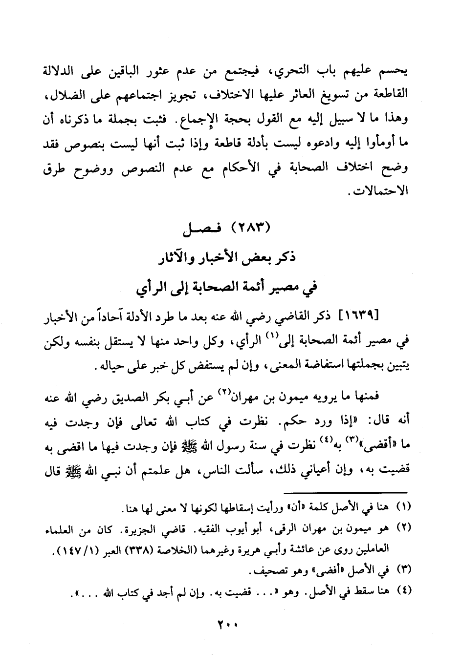 1639 - ذكر القَاضِي رَضِي الله عَنهُ بعد مَا طرد الْأَدِلَّة آحادا من الْأَخْبَار فِي مصير أَئِمَّة الصَّحَابَة إِلَى الرَّأْي، وكل وَاحِد مِنْهَا لَا يسْتَقلّ بِنَفسِهِ وَلَكِن يتَبَيَّن بجملتها استفاضة الْمَعْنى، وَإِن لم يستفض كل خبر على حياله.