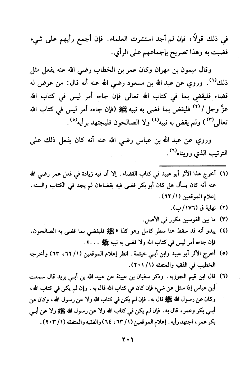 وَقَالَ مَيْمُون بن مهْرَان وَكَانَ عمر بن الْخطاب رَضِي الله عَنهُ يفعل مثل ذَلِك. وَرُوِيَ عَن عبد الله بن مَسْعُود رَضِي الله عَنهُ أَنه قَالَ: من عرض لَهُ قَضَاء فليقض بِمَا فِي كتاب الله تَعَالَى فَإِن جَاءَهُ أَمر لَيْسَ فِي كتاب الله عز وَجل / فليقض بِمَا قضى بِهِ نبيه [صلى الله عَلَيْهِ وَسلم] (فَإِن جَاءَهُ أَمر لَيْسَ فِي كتاب الله تَعَالَى) وَلم يقْض بِهِ نبيه وَلَا الصالحون فليجتهد بِرَأْيهِ.