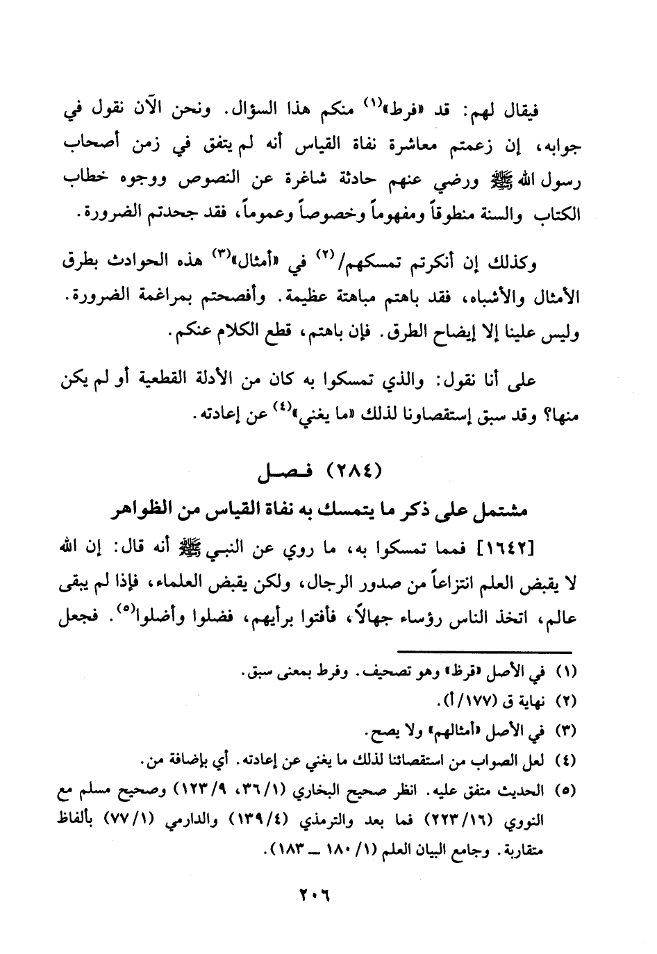 1642 - فمما تمسكوا بِهِ، مَا رُوِيَ عَن النَّبِي [صلى الله عَلَيْهِ وَسلم] أَنه قَالَ: إِن الله لَا يقبض الْعلم انتزاعا من صُدُور الرِّجَال، وَلَكِن يقبض الْعلمَاء، فَإِذا لم يبْقى عَالم، اتخذ النَّاس رُؤَسَاء جُهَّالًا، فأفتوا برأيهم، فضلوا وأضلوا. فَجعل