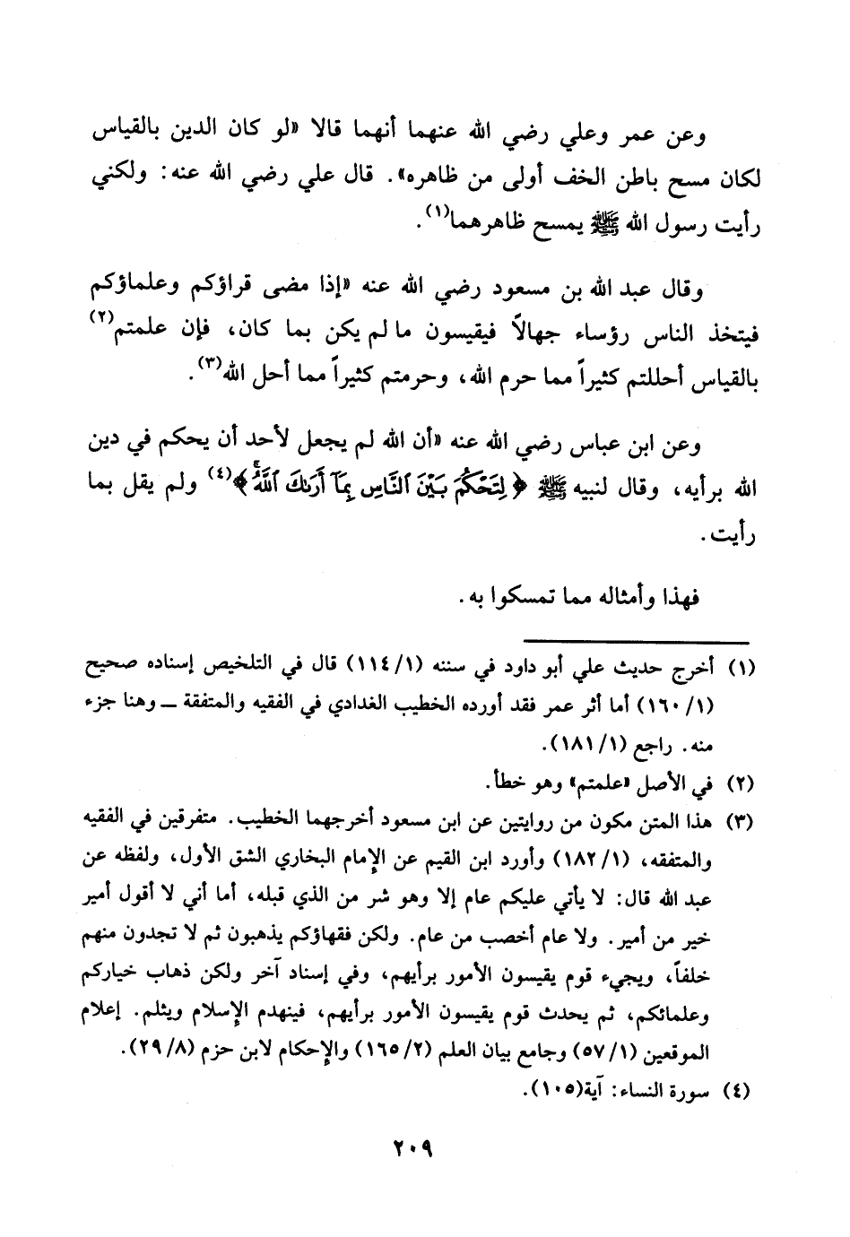 وَقَالَ عبد الله بن مَسْعُود رَضِي الله عَنهُ " إِذا مضى قراؤكم وعلماؤكم فيتخذ النَّاس رُؤَسَاء جُهَّالًا فيقيسون مَا لم يكن بِمَا كَانَ، فَإِن علمْتُم بِالْقِيَاسِ أحللتم كثيرا مِمَّا حرم الله، وحرمتم كثيرا مِمَّا أحل الله.