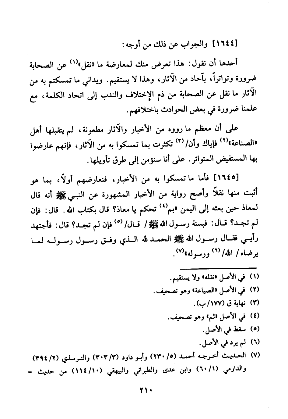 1645 - فَأَما مَا تمسكوا بِهِ من الْأَخْبَار، فنعارضهم أَولا، بِمَا هُوَ أثبت مِنْهَا نقلا وَأَصَح رِوَايَة من الْأَخْبَار الْمَشْهُورَة عَن النَّبِي [صلى الله عَلَيْهِ وَسلم] أَنه قَالَ لِمعَاذ حِين بَعثه إِلَى الْيمن " بِمَ تحكم يَا معَاذ؟ قَالَ بِكِتَاب الله. قَالَ: فَإِن لم تَجِد؟ قَالَ: فبسنة رَسُول الله [صلى الله عَلَيْهِ وَسلم] / قَالَ / فَإِن لم تَجِد؟ قَالَ: فأجتهد رَأْيِي فَقَالَ رَسُول الله [صلى الله عَلَيْهِ وَسلم] الْحَمد لله الَّذِي وفْق رَسُول رَسُوله لما يرضاه / الله / وَرَسُوله.