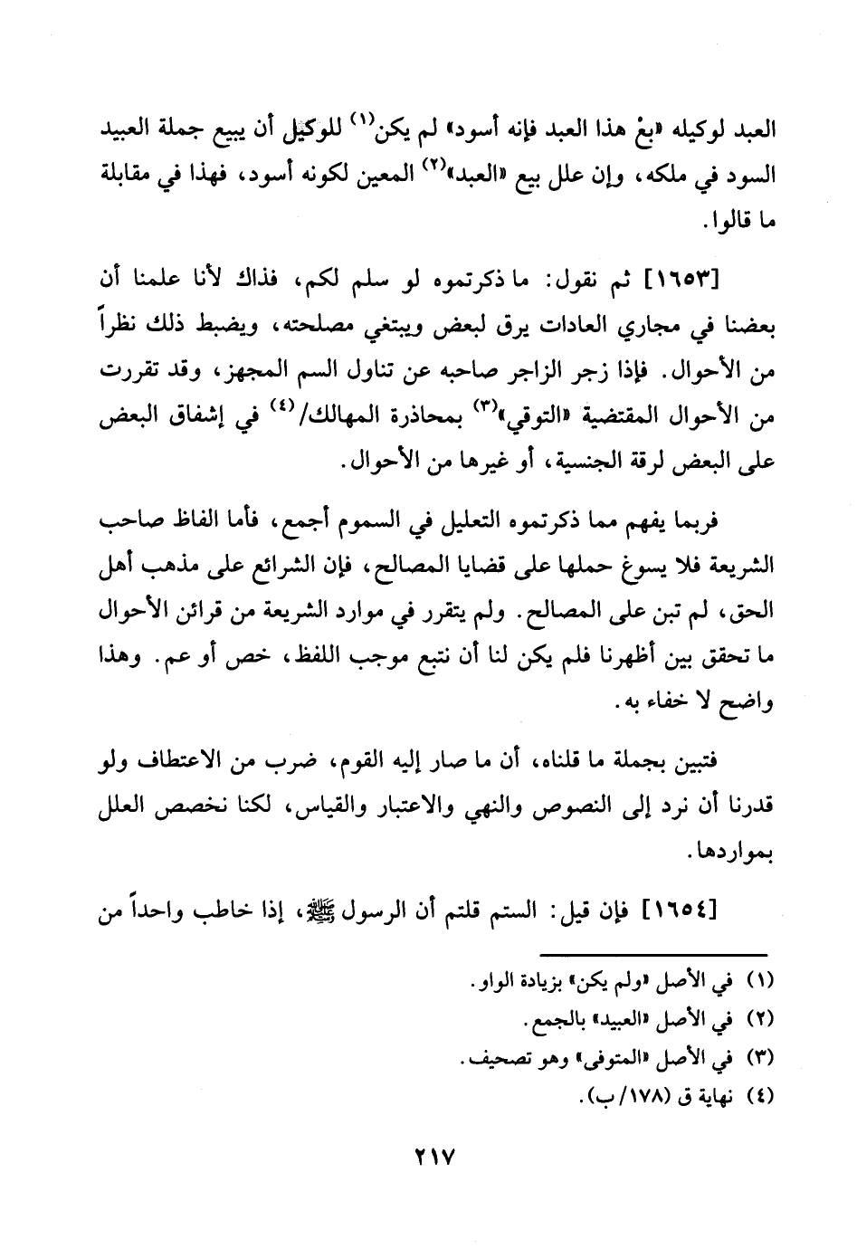 1653 - ثمَّ نقُول: مَا ذكرتموه لَو سلم لكم فَذَاك لأَنا علمنَا أَن بَعْضنَا فِي مجاري الْعَادَات يرق لبَعض ويبتغي مصْلحَته، ويضبط ذَلِك نظرا من الْأَحْوَال. فَإِذا زجر الزاجر صَاحبه عَن تنَاول السم المجهز، وَقد تقررت من الْأَحْوَال الْمُقْتَضِيَة " التوقي " بمحاذرة المهالك / فِي إشفاق الْبَعْض على الْبَعْض لرقة الجنسية، أَو غَيرهَا من الْأَحْوَال.