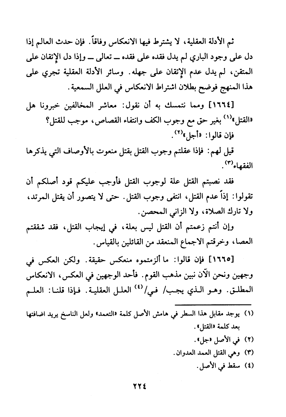 1665 - فَإِن قَالُوا: مَا ألزمتموه منعكس حَقِيقَة. وَلَكِن الْعَكْس فِي وَجْهَيْن وَنحن الْآن نبين مَذْهَب الْقَوْم. فأحد الْوَجْهَيْنِ فِي الْعَكْس، الانعكاس الْمُطلق. وَهُوَ الَّذِي يجب / فِي / الْعِلَل الْعَقْلِيَّة. فَإِذا قُلْنَا: الْعلم