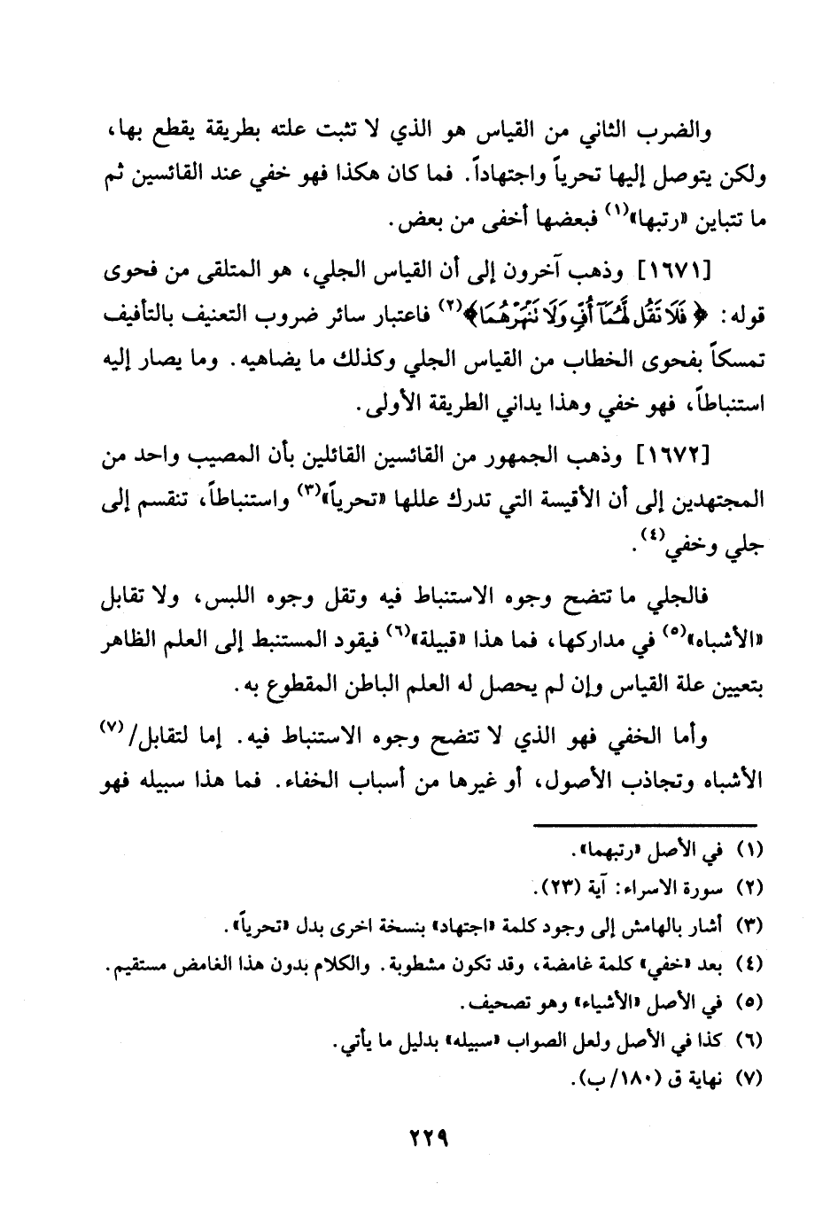1672 - وَذهب الْجُمْهُور من القائسين الْقَائِلين بِأَن الْمُصِيب وَاحِد من الْمُجْتَهدين إِلَى أَن الأقيسة الَّتِي تدْرك عللها " تحريا " واستنباطا، تَنْقَسِم إِلَى جلي وخفي.