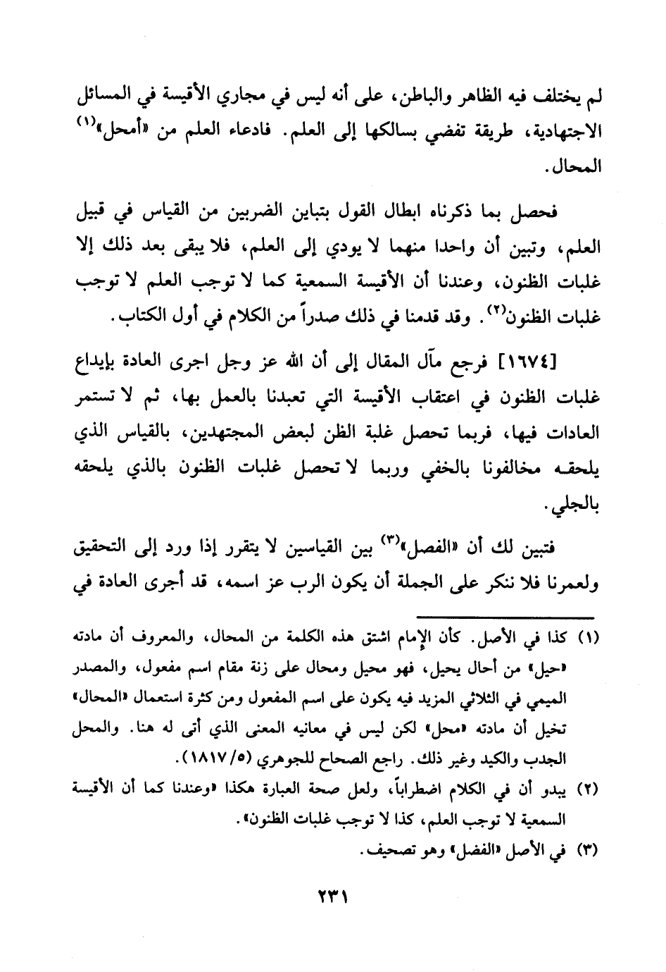 1674 - فَرجع مآل الْمقَال إِلَى أَن الله عز وَجل اجرى الْعَادة بإيداع غلبات الظنون فِي اعتقاب الأقيسة الَّتِي تعبدنا بِالْعَمَلِ بهَا، ثمَّ لَا تستمر الْعَادَات فِيهَا، فَرُبمَا تحصل غَلَبَة الظَّن لبَعض الْمُجْتَهدين، بِالْقِيَاسِ الَّذِي يلْحقهُ مخالفونا بالخفي وَرُبمَا لَا تحصل غلبات الظنون بِالَّذِي يلْحقهُ بالجلي.