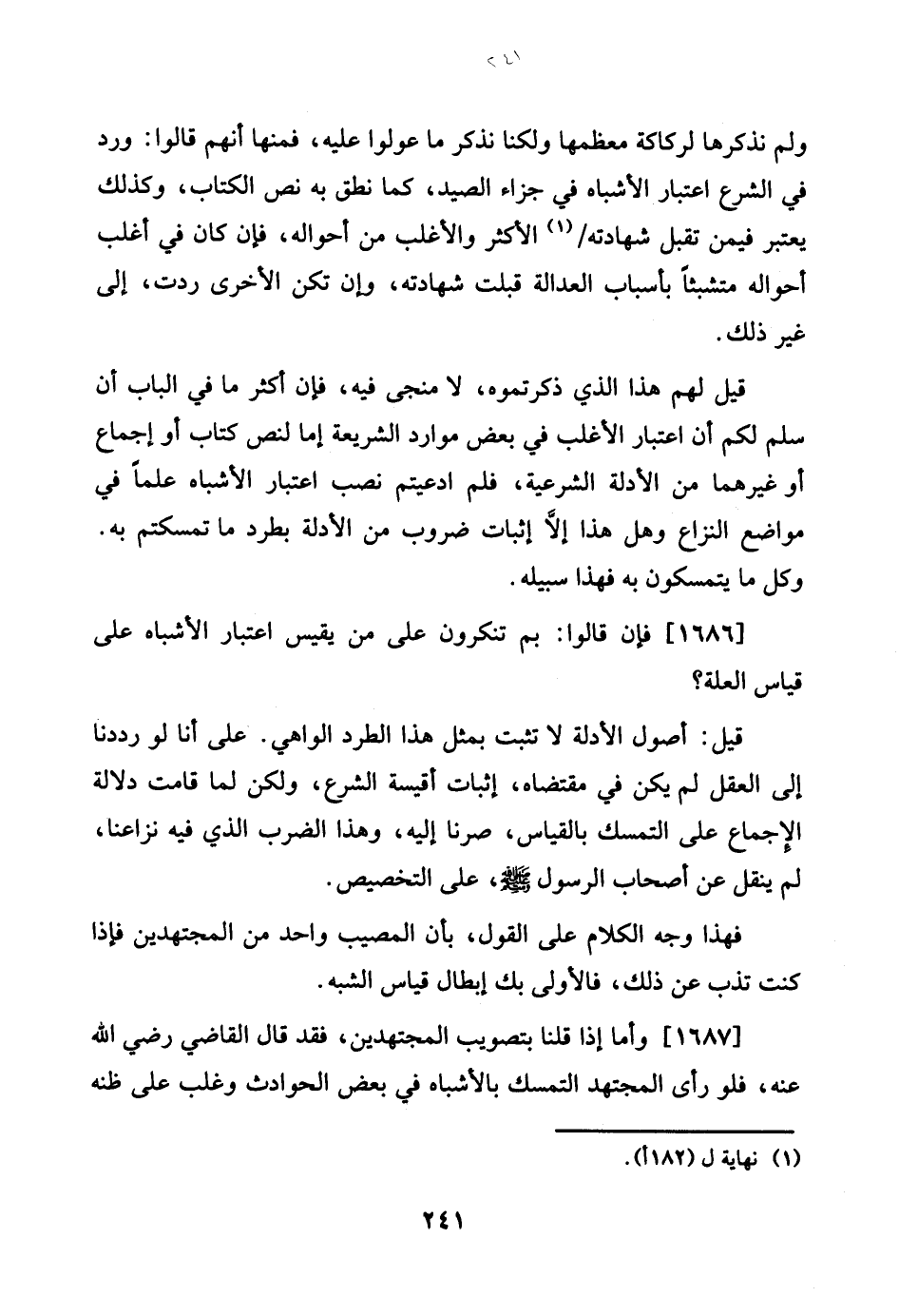1687 - وَأما إِذا قُلْنَا بتصويب الْمُجْتَهدين، فقد قَالَ القَاضِي رَضِي الله عَنهُ، فَلَو رأى الْمُجْتَهد التَّمَسُّك بالأشباه فِي بعض الْحَوَادِث وَغلب على ظَنّه