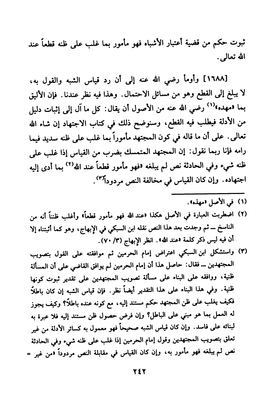 1688 - وَأَوْمَأَ رَضِي الله عَنهُ إِلَى أَن رد قِيَاس الشّبَه وَالْقَوْل بِهِ، لَا يبلغ إِلَى الْقطع وَهُوَ من مسَائِل الِاحْتِمَال. وَهَذَا فِيهِ نظر عندنَا. فَإِن الْأَلْيَق بِمَا " مهده " رَضِي الله عَنهُ من الْأُصُول أَن يُقَال: كل مَا آل إِلَى إِثْبَات دَلِيل من الْأَدِلَّة فيطلب فِيهِ الْقطع، وسنوضح ذَلِك فِي كتاب الِاجْتِهَاد إِن شَاءَ الله تَعَالَى. على أَن مَا قَالَه فِي كَون الْمُجْتَهد مَأْمُورا بِمَا غلب على ظَنّه سديد فِيمَا رامه فَإنَّا رُبمَا نقُول: إِن الْمُجْتَهد المتمسك بِضَرْب من الْقيَاس إِذا غلب على ظَنّه شَيْء وَفِي الْحَادِثَة نَص لم يبلغهُ " فَهُوَ مَأْمُور قطعا عِنْد الله بِمَا أدّى إِلَيْهِ اجْتِهَاده. وَإِن كَانَ الْقيَاس فِي مُخَالفَة النَّص مردودا.