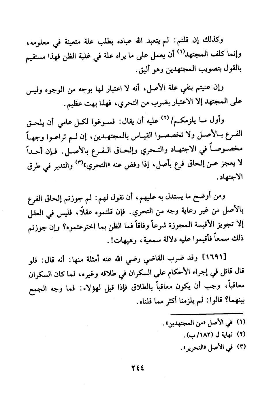 1691 - وَقد ضرب القَاضِي رَضِي الله عَنهُ أَمْثِلَة مِنْهَا: أَنه قَالَ: فَلَو قَالَ قَائِل فِي إِجْرَاء الْأَحْكَام على السَّكْرَان فِي طَلَاقه وَغَيره، لما كَانَ السَّكْرَان معاقبا، وَجب أَن يكون معاقبا بِالطَّلَاق فَإِذا قيل لهَؤُلَاء: فَمَا وَجه الْجمع بَينهمَا؟ قَالُوا: لم يلْزمنَا أَكثر مِمَّا قُلْنَاهُ.