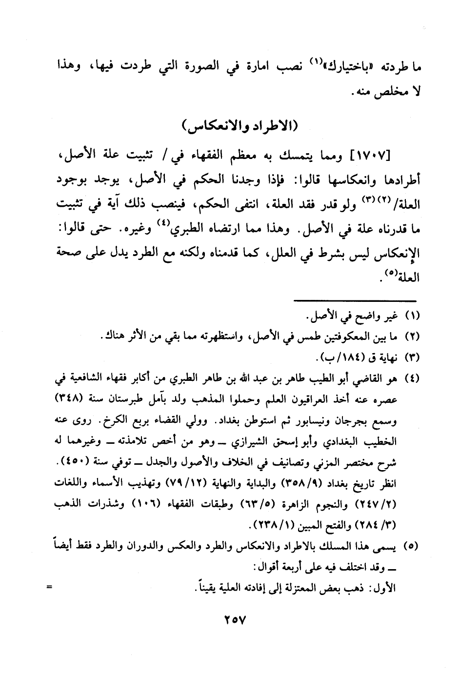 1707 - وَمِمَّا يتَمَسَّك بِهِ مُعظم الْفُقَهَاء فِي / تثبيت عِلّة الأَصْل، أطرادها وانعكاسها قَالُوا: فَإِذا وجدنَا الحكم فِي الأَصْل، يُوجد بِوُجُود الْعلَّة / وَلَو قدر فقد الْعلَّة، انْتَفَى الحكم، فينصب ذَلِك آيَة فِي تثبيت مَا قدرناه عِلّة فِي الأَصْل. وَهَذَا مِمَّا ارْتَضَاهُ الطَّبَرِيّ وَغَيره. حَتَّى قَالُوا: الإنعكاس لَيْسَ بِشَرْط فِي الْعِلَل، كَمَا قدمْنَاهُ وَلكنه مَعَ الطَّرْد يدل على صِحَة الْعلَّة.