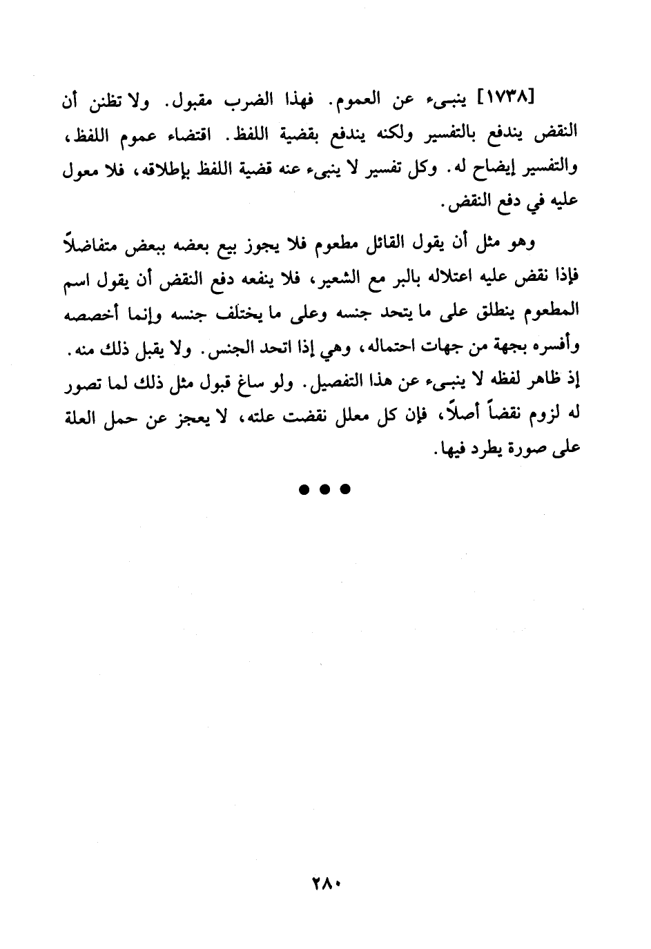 1738 - يُنبئ عَن الْعُمُوم. فَهَذَا الضَّرْب مَقْبُول. وَلَا تَظنن أَن النَّقْض ينْدَفع بالتفسير وَلكنه ينْدَفع بقضية اللَّفْظ. اقْتِضَاء عُمُوم اللَّفْظ، وَالتَّفْسِير إِيضَاح لَهُ. وكل تَفْسِير لَا يُنبئ عَنهُ قَضِيَّة اللَّفْظ بِإِطْلَاقِهِ، فَلَا معول عَلَيْهِ فِي دفع النَّقْض.