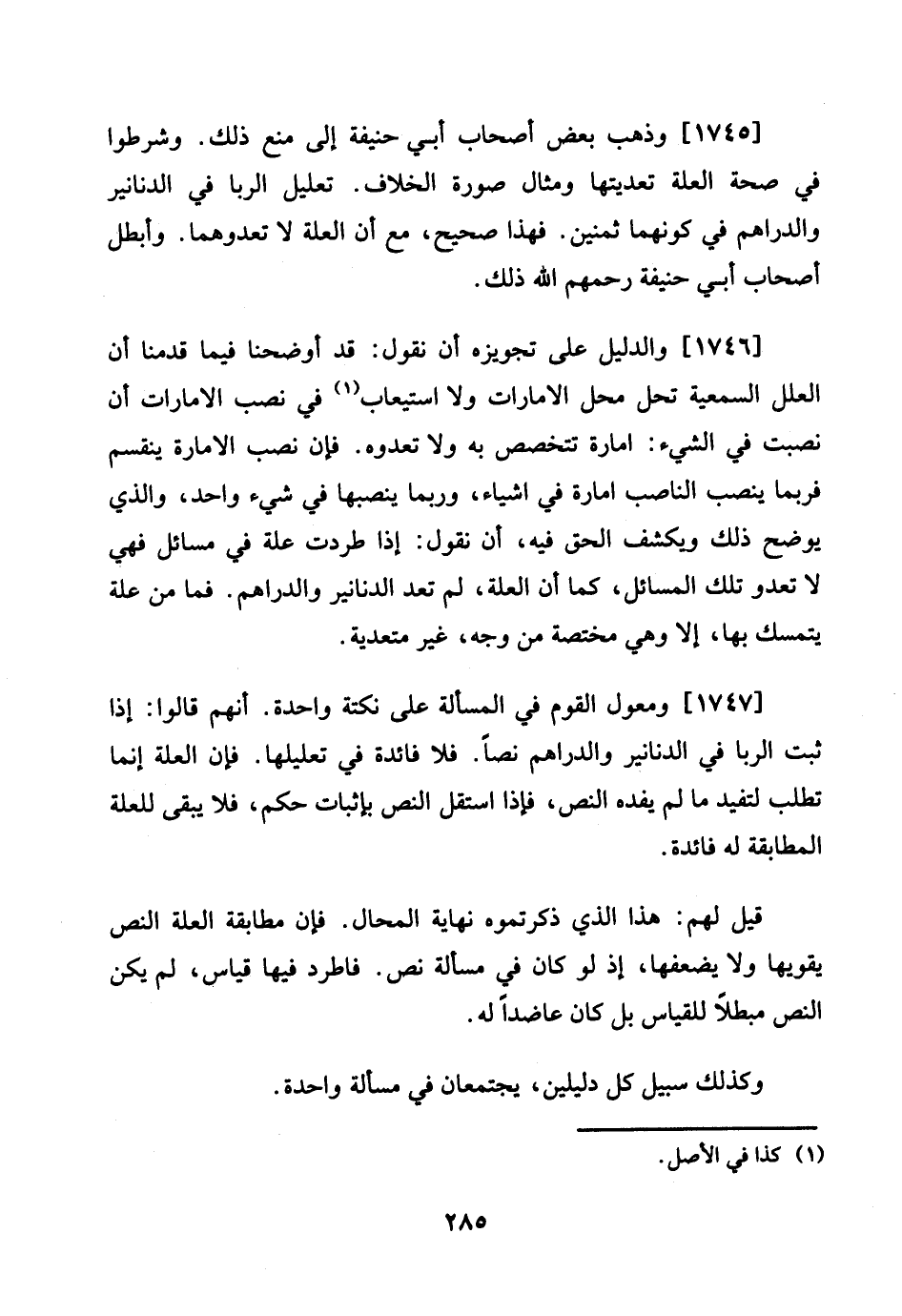 1745 - وَذهب بعض أَصْحَاب أبي حنيفَة إِلَى منع ذَلِك. وشرطوا فِي صِحَة الْعلَّة تعديتها وَمِثَال صُورَة الْخلاف. تَعْلِيل الرِّبَا فِي الدَّنَانِير وَالدَّرَاهِم فِي كَونهمَا ثمنين. فَهَذَا صَحِيح، مَعَ أَن الْعلَّة لَا تعدوهما. وأبطل أَصْحَاب أبي حنيفَة رَحِمهم الله ذَلِك.