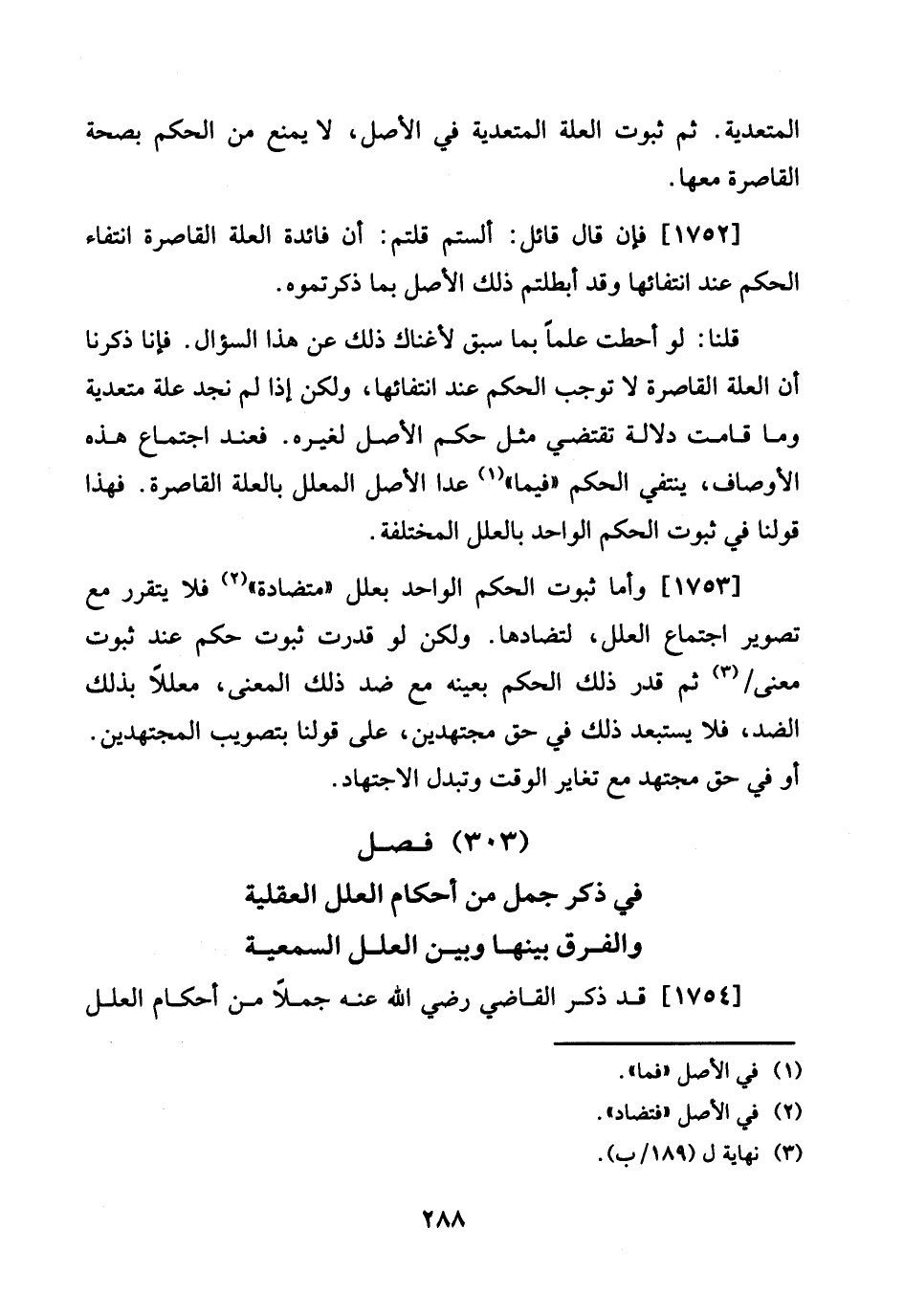 1753 - وَأما ثُبُوت الحكم الْوَاحِد بعلل " متضادة " فَلَا يَتَقَرَّر مَعَ تَصْوِير اجْتِمَاع الْعِلَل، لتضادها. وَلَكِن لَو قدرت ثُبُوت حكم عِنْد ثُبُوت معنى / ثمَّ قدر ذَلِك الحكم بِعَيْنِه مَعَ ضد ذَلِك الْمَعْنى، مُعَللا بذلك الضِّدّ، فَلَا يستبعد ذَلِك فِي حق مجتهدين، على قَوْلنَا بتصويب الْمُجْتَهدين. أَو فِي حق مُجْتَهد مَعَ تغاير الْوَقْت وتبدل الِاجْتِهَاد.