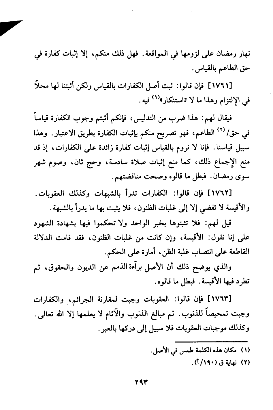 1762 - فَإِن قَالُوا: الْكَفَّارَات تدرأ بِالشُّبُهَاتِ وَكَذَلِكَ الْعُقُوبَات. والأقيسة لَا تُفْضِي إِلَّا إِلَى غلبات الظنون، فَلَا يثبت بهَا مَا يدْرَأ بِالشُّبْهَةِ.