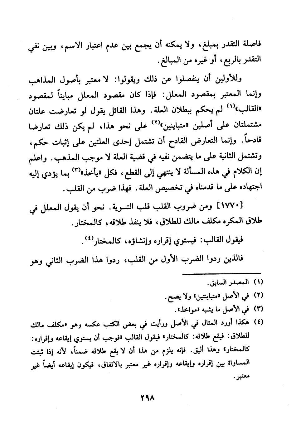 1770 - وَمن ضروب الْقلب قلب التَّسْوِيَة. نَحْو أَن يَقُول الْمُعَلل فِي طَلَاق الْمُكْره مُكَلّف مَالك للطَّلَاق، فَلَا ينفذ طَلَاقه، كالمختار.