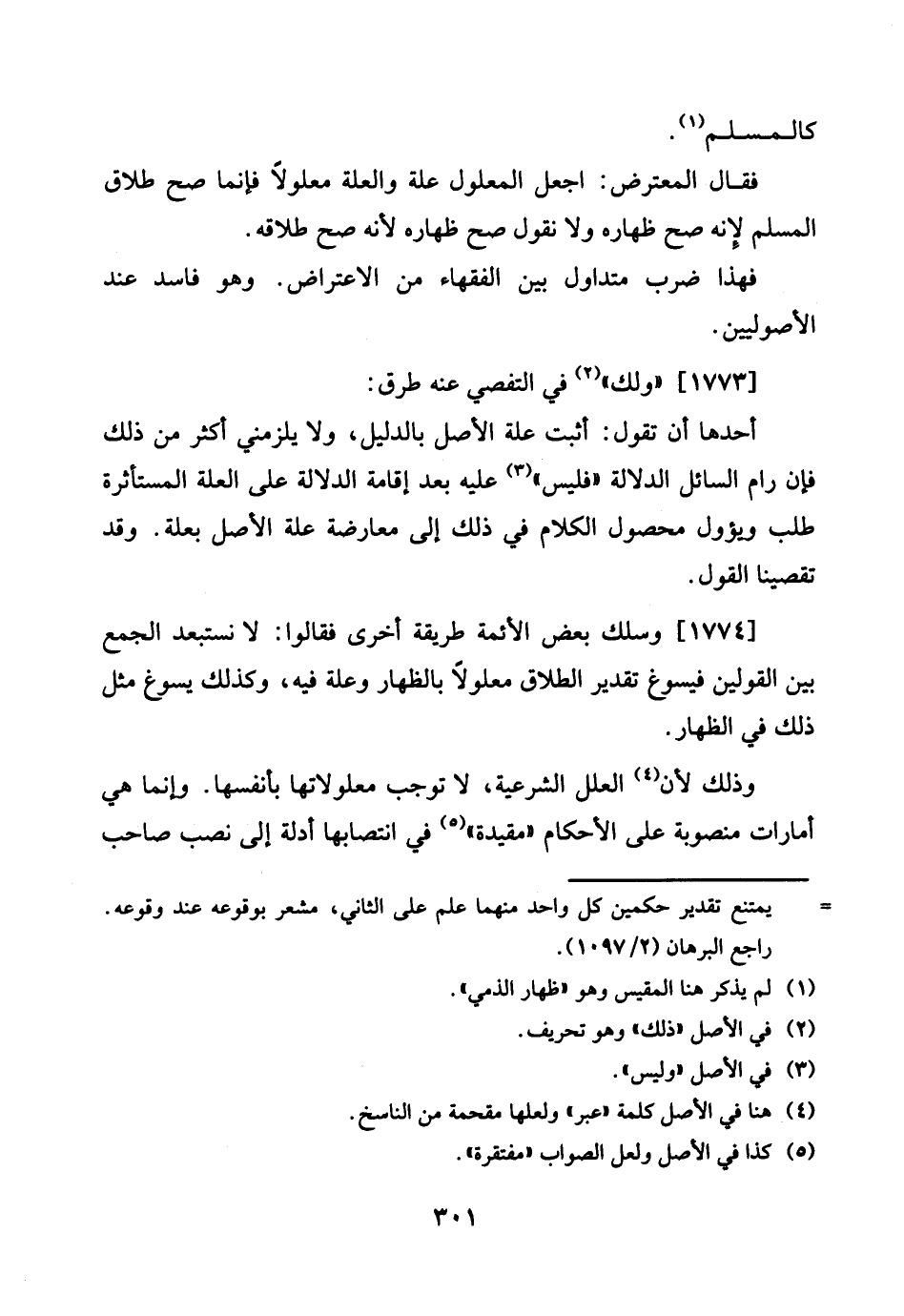 1774 - وسلك بعض الْأَئِمَّة طَريقَة أُخْرَى فَقَالُوا: لَا نستبعد الْجمع بَين الْقَوْلَيْنِ فيسوغ تَقْدِير الطَّلَاق معلولا بالظهار وَعلة فِيهِ، وَكَذَلِكَ يسوغ مثل ذَلِك فِي الظِّهَار.