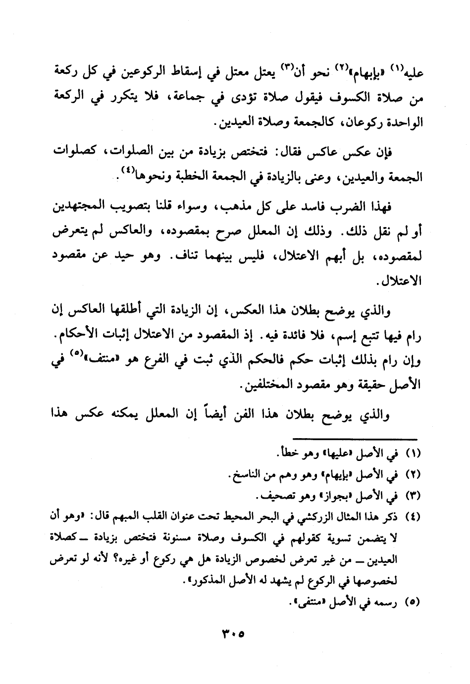 عَلَيْهِ " بإبهام " نَحْو أَن يعتل معتل فِي إِسْقَاط الركوعين فِي كل رَكْعَة من صَلَاة الْكُسُوف فَيَقُول صَلَاة تُؤَدّى فِي جمَاعَة، فَلَا يتَكَرَّر فِي الرَّكْعَة الْوَاحِدَة ركوعان، كَالْجُمُعَةِ وَصَلَاة الْعِيدَيْنِ.