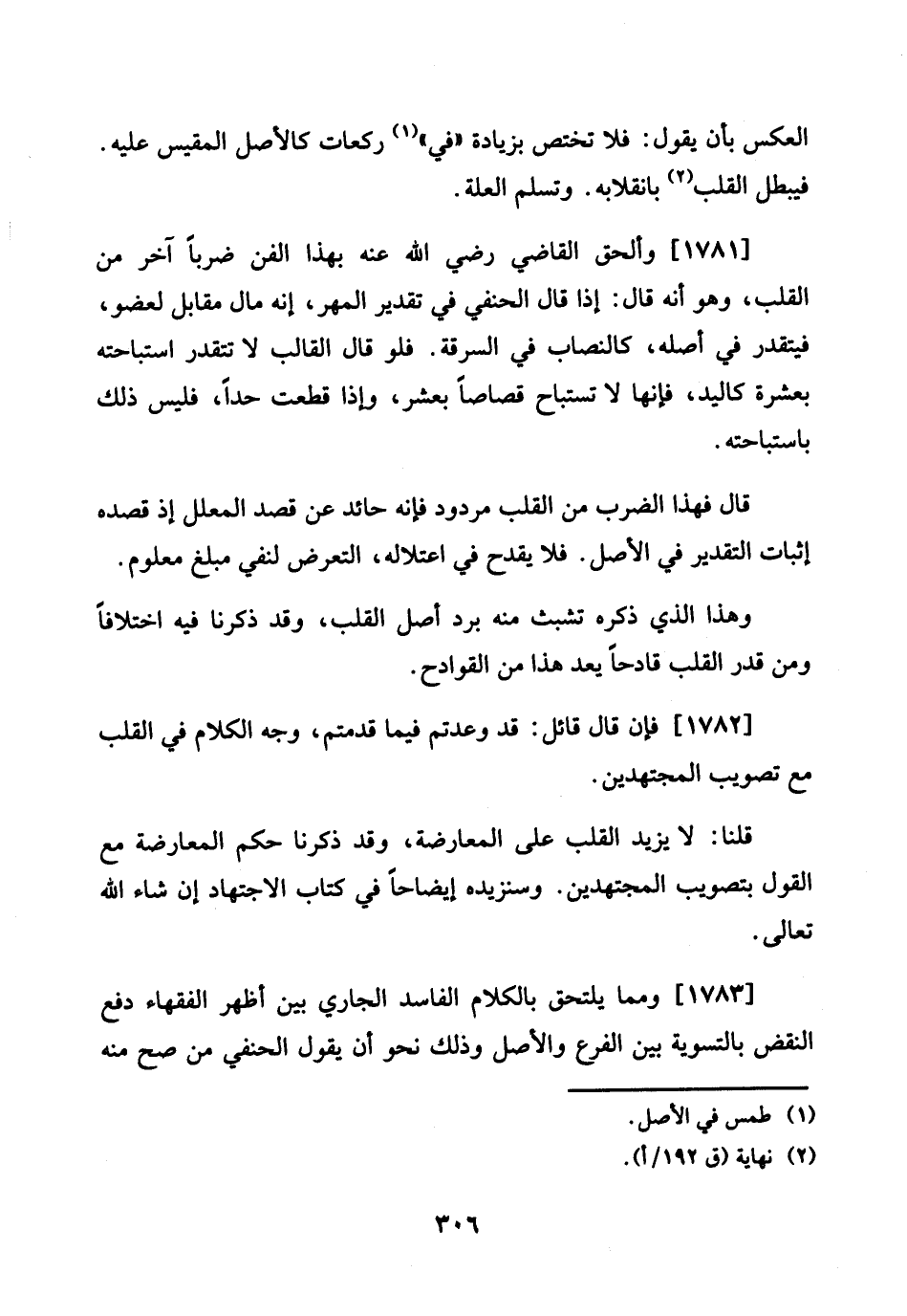 1781 - وَألْحق القَاضِي رَضِي الله عَنهُ بِهَذَا الْفَنّ ضربا آخر من الْقلب، وَهُوَ أَنه قَالَ: إِذا قَالَ الْحَنَفِيّ فِي تَقْدِير الْمهْر، إِنَّه مَال مُقَابل لعضو، فيتقدر فِي أَصله كالنصاب فِي السّرقَة. فَلَو قَالَ القالب لَا تتقدر استباحته بِعشْرَة كَالْيَدِ، فَإِنَّهَا لَا تستباح قصاصا بِعشر، وَإِذا قطعت حدا، فَلَيْسَ ذَلِك باستباحته.