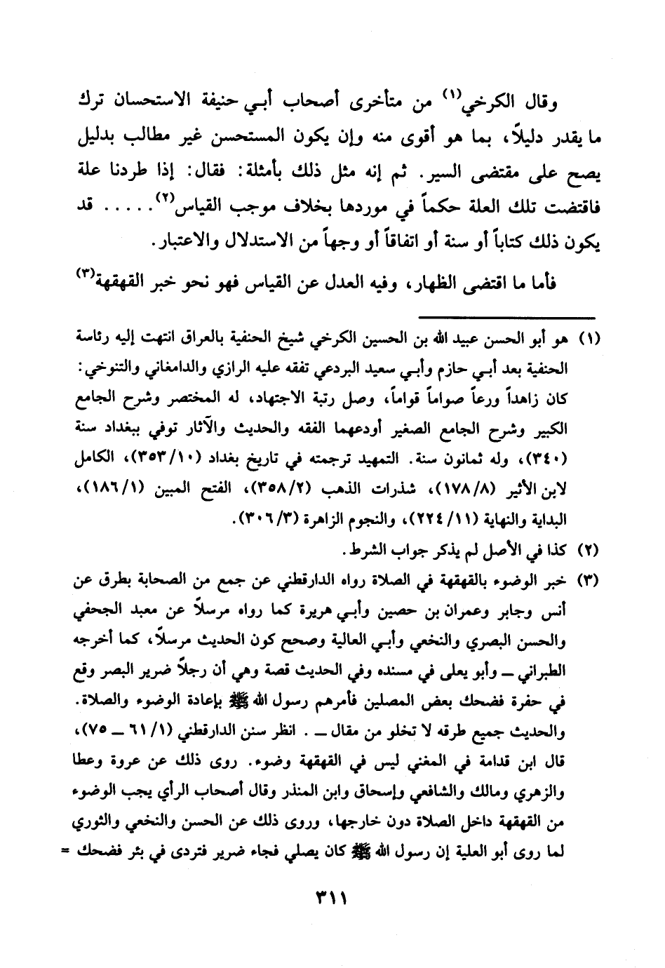 وَقَالَ الْكَرْخِي من متأخرى أَصْحَاب أبي حنيفَة الِاسْتِحْسَان ترك مَا يقدر دَلِيلا، بِمَا هُوَ أقوى مِنْهُ وَإِن يكون المستحسن غير مطَالب بِدَلِيل يَصح على مُقْتَضى السّير. ثمَّ إِنَّه مثل ذَلِك بأمثلة: فَقَالَ: إِذا طردنا عِلّة فاقتضت تِلْكَ الْعلَّة حكما فِي موردها بِخِلَاف مُوجب الْقيَاس ... . قد يكون ذَلِك كتابا أَو سنة أَو اتِّفَاقًا أَو وَجها من الِاسْتِدْلَال وَالِاعْتِبَار.