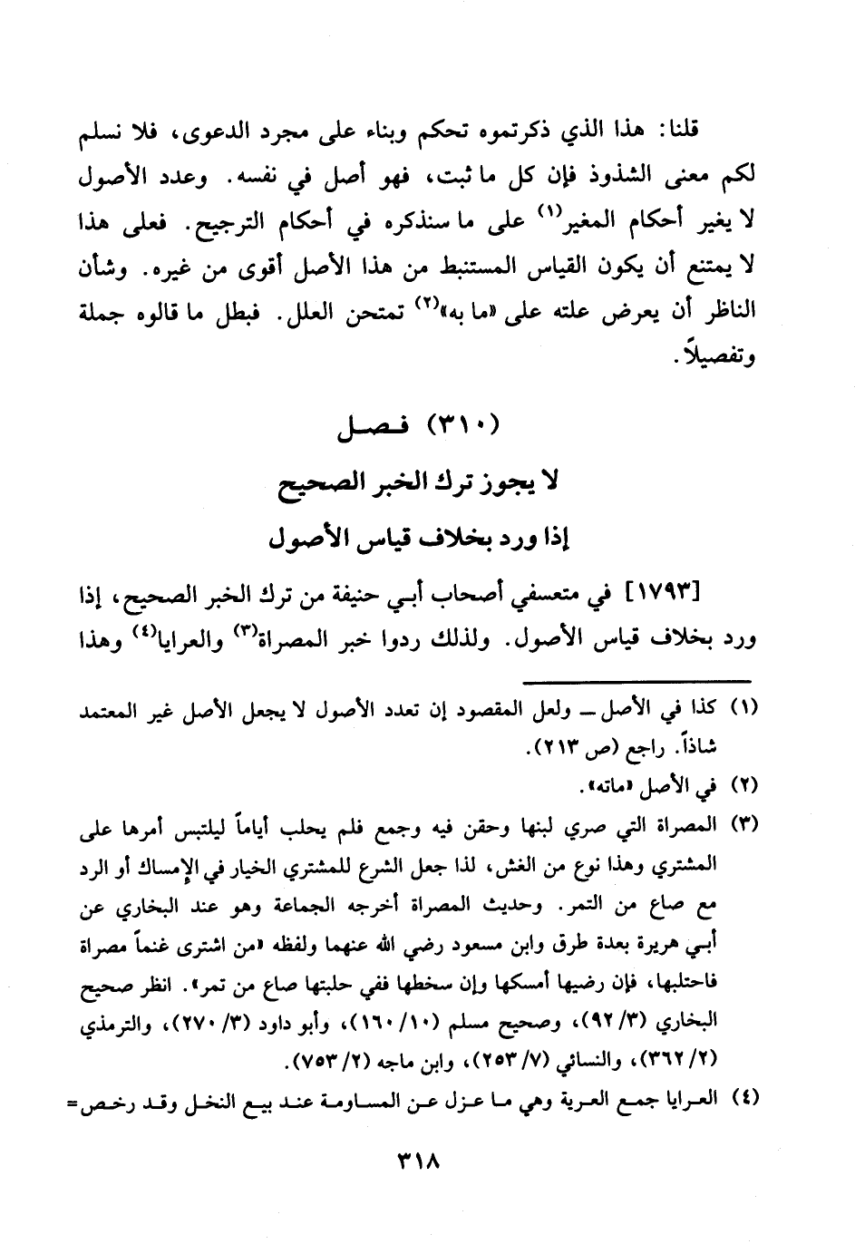 (310) فصل لَا يجوز ترك الْخَبَر الصَّحِيح إِذا ورد بِخِلَاف قِيَاس الْأُصُول