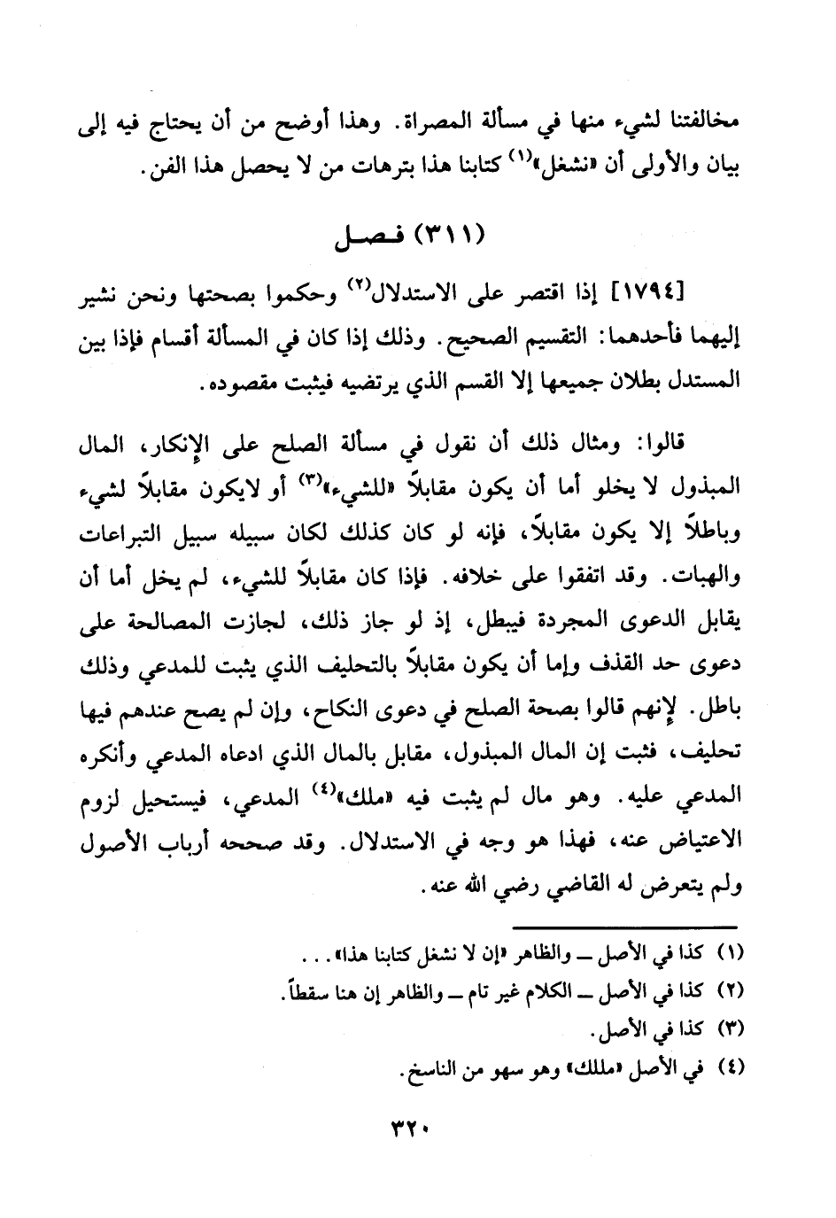 قَالُوا: وَمِثَال ذَلِك أَن نقُول فِي مَسْأَلَة الصُّلْح على الْإِنْكَار، المَال المبذول لَا يَخْلُو أما أَن يكون مُقَابلا " للشَّيْء " أَو لَا يكون مُقَابلا لشَيْء وباطلا إِلَّا يكون مُقَابلا، فَإِنَّهُ لَو كَانَ كَذَلِك لَكَانَ سَبيله سَبِيل التَّبَرُّعَات والهبات. وَقد اتَّفقُوا على خِلَافه. فَإِذا كَانَ مُقَابلا للشَّيْء، لم يخل أما أَن يُقَابل الدَّعْوَى الْمُجَرَّدَة فَيبْطل، إِذْ لَو جَازَ ذَلِك، لجازت الْمُصَالحَة على دَعْوَى حد الْقَذْف وَإِمَّا أَن يكون مُقَابلا بالتحليف الَّذِي يثبت للْمُدَّعِي وَذَلِكَ بَاطِل. لإنهم قَالُوا بِصِحَّة الصُّلْح فِي دَعْوَى النِّكَاح، وَإِن لم يَصح عِنْدهم فِيهَا تَحْلِيف، فَثَبت إِن المَال المبذول، مُقَابل بِالْمَالِ الَّذِي ادَّعَاهُ الْمُدَّعِي وَأنْكرهُ الْمُدَّعِي عَلَيْهِ. وَهُوَ مَال لم يثبت فِيهِ " ملك " الْمُدَّعِي، فيستحيل لُزُوم الِاعْتِيَاض عَنهُ، فَهَذَا هُوَ وَجه فِي الِاسْتِدْلَال. وَقد صَححهُ أَرْبَاب الْأُصُول وَلم يتَعَرَّض لَهُ القَاضِي رَضِي الله عَنهُ.