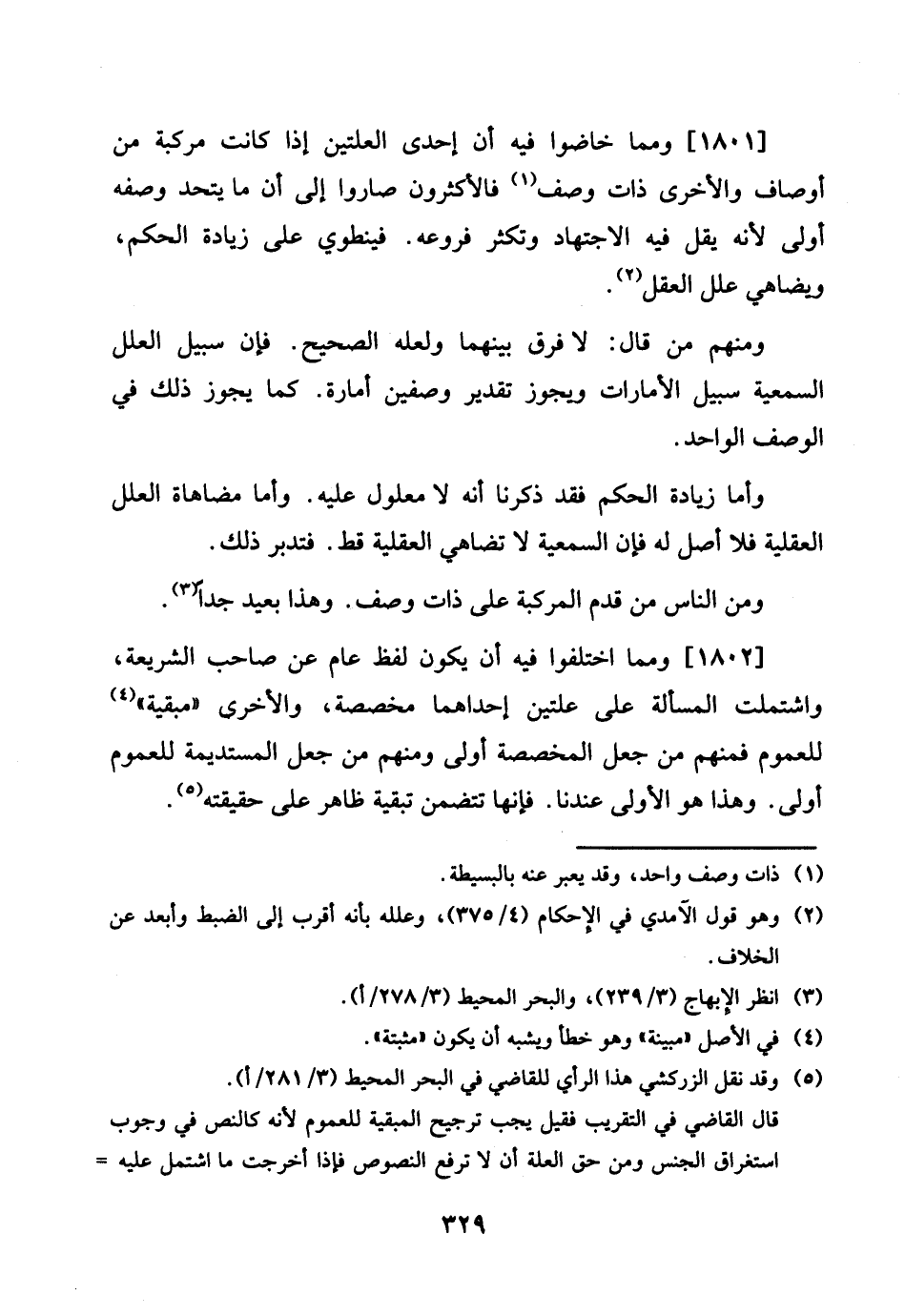 1801 - وَمِمَّا خَاضُوا فِيهِ أَن إِحْدَى العلتين إِذا كَانَت مركبة من أَوْصَاف وَالْأُخْرَى ذَات وصف فالأكثرون صَارُوا إِلَى أَن مَا يتحد وَصفه أولى لِأَنَّهُ يقل فِيهِ الِاجْتِهَاد وتكثر فروعه. فينطوي على زِيَادَة الحكم، ويضاهي علل الْعقل.