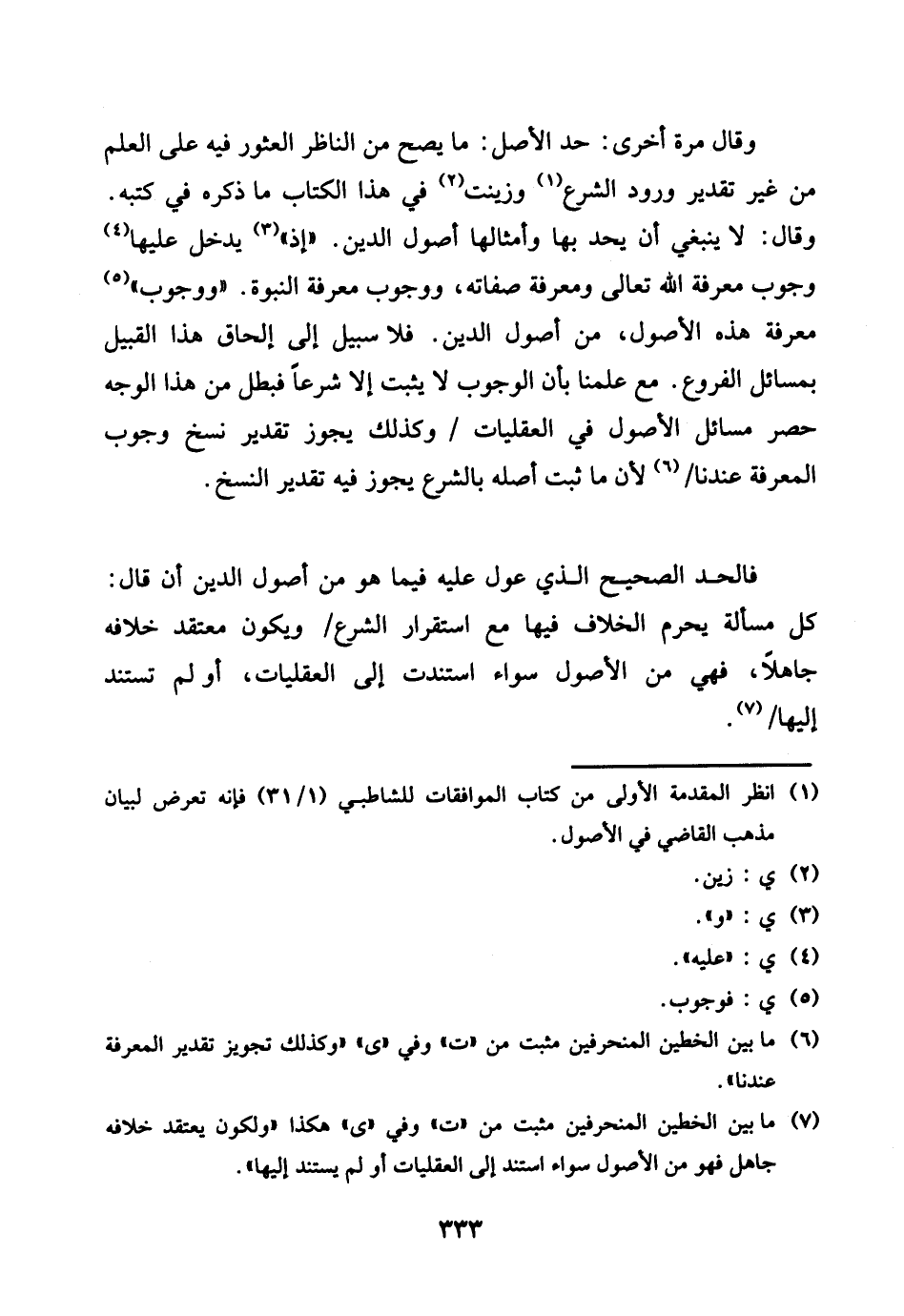 فالحد الصَّحِيح الَّذِي عول عَلَيْهِ فِيمَا هُوَ من أصُول الدّين أَن قَالَ: كل مَسْأَلَة يحرم الْخلاف فِيهَا مَعَ اسْتِقْرَار الشَّرْع / وَيكون مُعْتَقد خِلَافه جَاهِلا، فَهِيَ من الْأُصُول سَوَاء استندت إِلَى العقليات، أَو لم تستند إِلَيْهَا /.