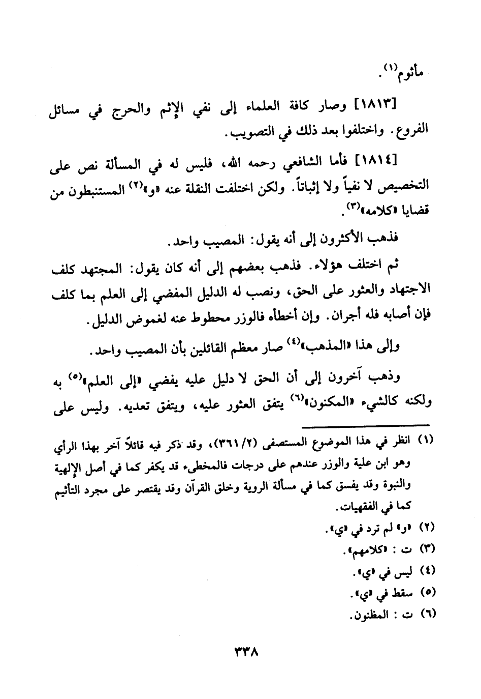 1813 - وَصَارَ كَافَّة الْعلمَاء إِلَى نفي الْإِثْم والحرج فِي مسَائِل الْفُرُوع. وَاخْتلفُوا بعد ذَلِك فِي التصويب.