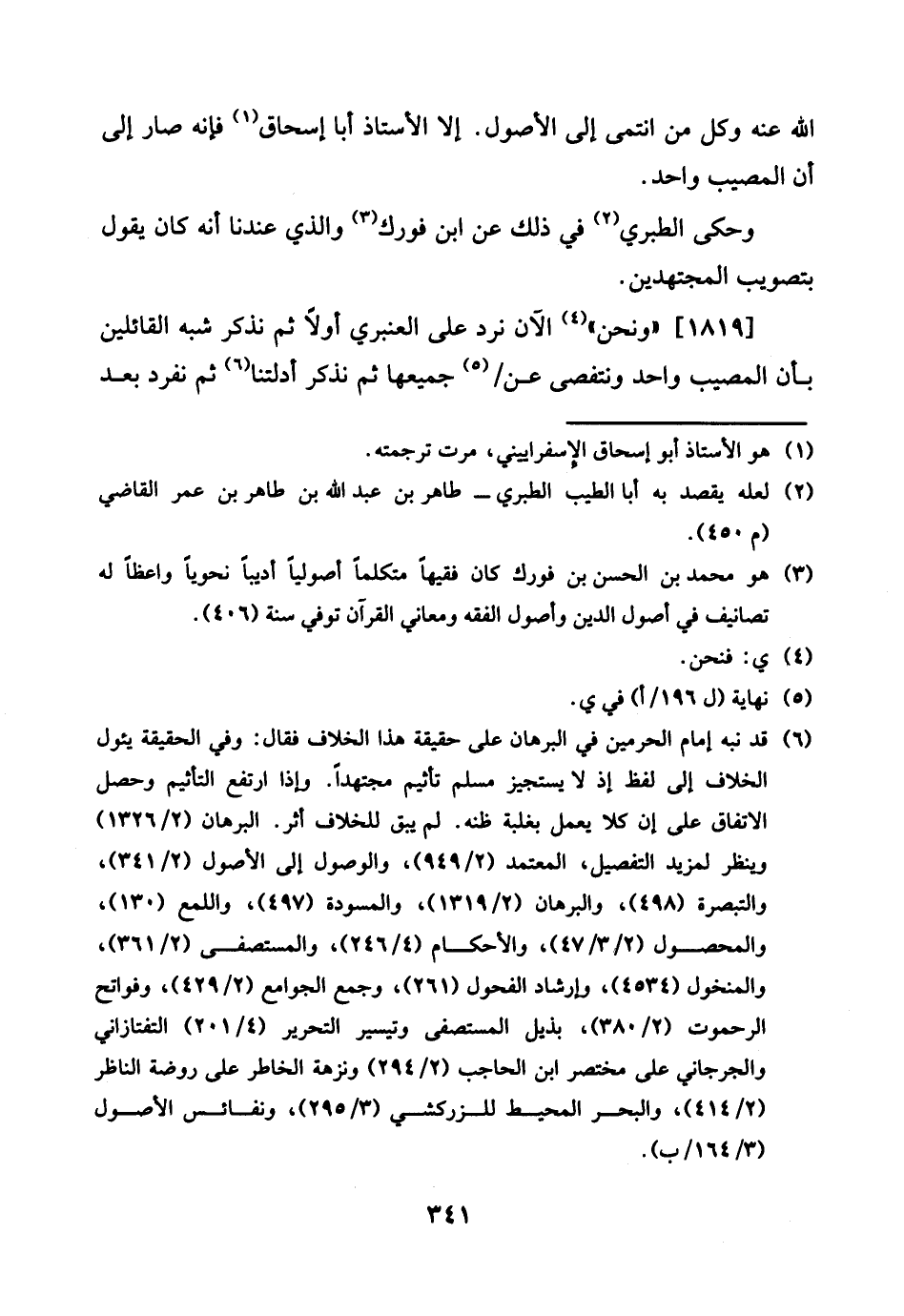 الله عَنهُ وكل من انْتَمَى إِلَى الْأُصُول. إِلَّا الْأُسْتَاذ أَبَا إِسْحَاق فَإِنَّهُ صَار إِلَى أَن الْمُصِيب وَاحِد.