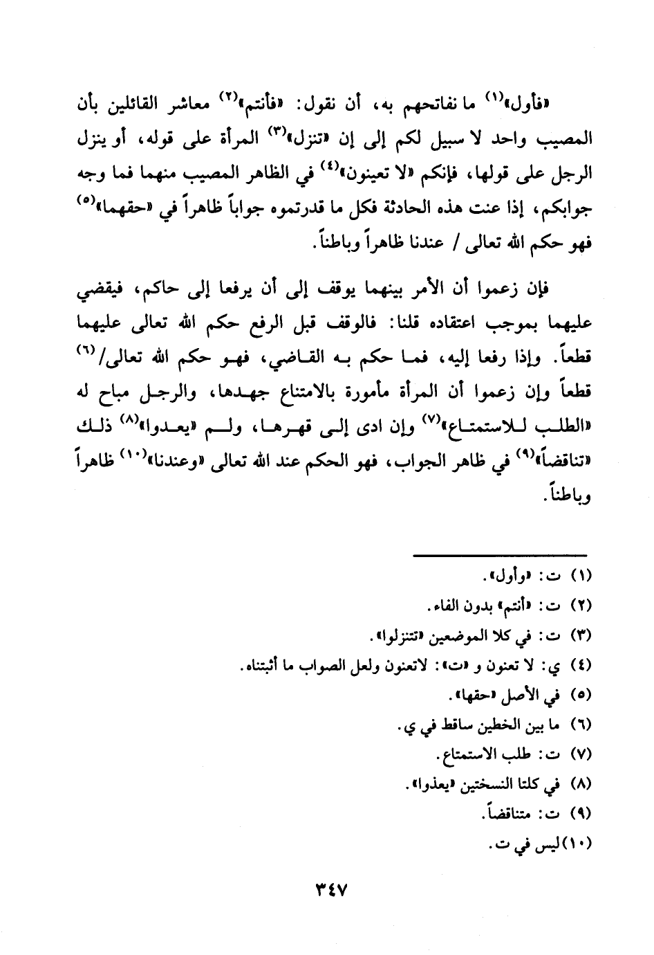 " فَأول " مَا نفاتحهم بِهِ، أَن نقُول: " فَأنْتم " معاشر الْقَائِلين بِأَن الْمُصِيب وَاحِد لَا سَبِيل لكم إِلَى إِن " تنزل " الْمَرْأَة على قَوْله، أَو ينزل الرجل على قَوْلهَا، فَإِنَّكُم " لَا تعينون " فِي الظَّاهِر الْمُصِيب مِنْهُمَا فَمَا وَجه جوابكم، إِذا عنت هَذِه الْحَادِثَة فَكل مَا قدرتموه جَوَابا ظَاهرا فِي " حَقّهمَا " فَهُوَ حكم الله تَعَالَى / عندنَا ظَاهرا وَبَاطنا.