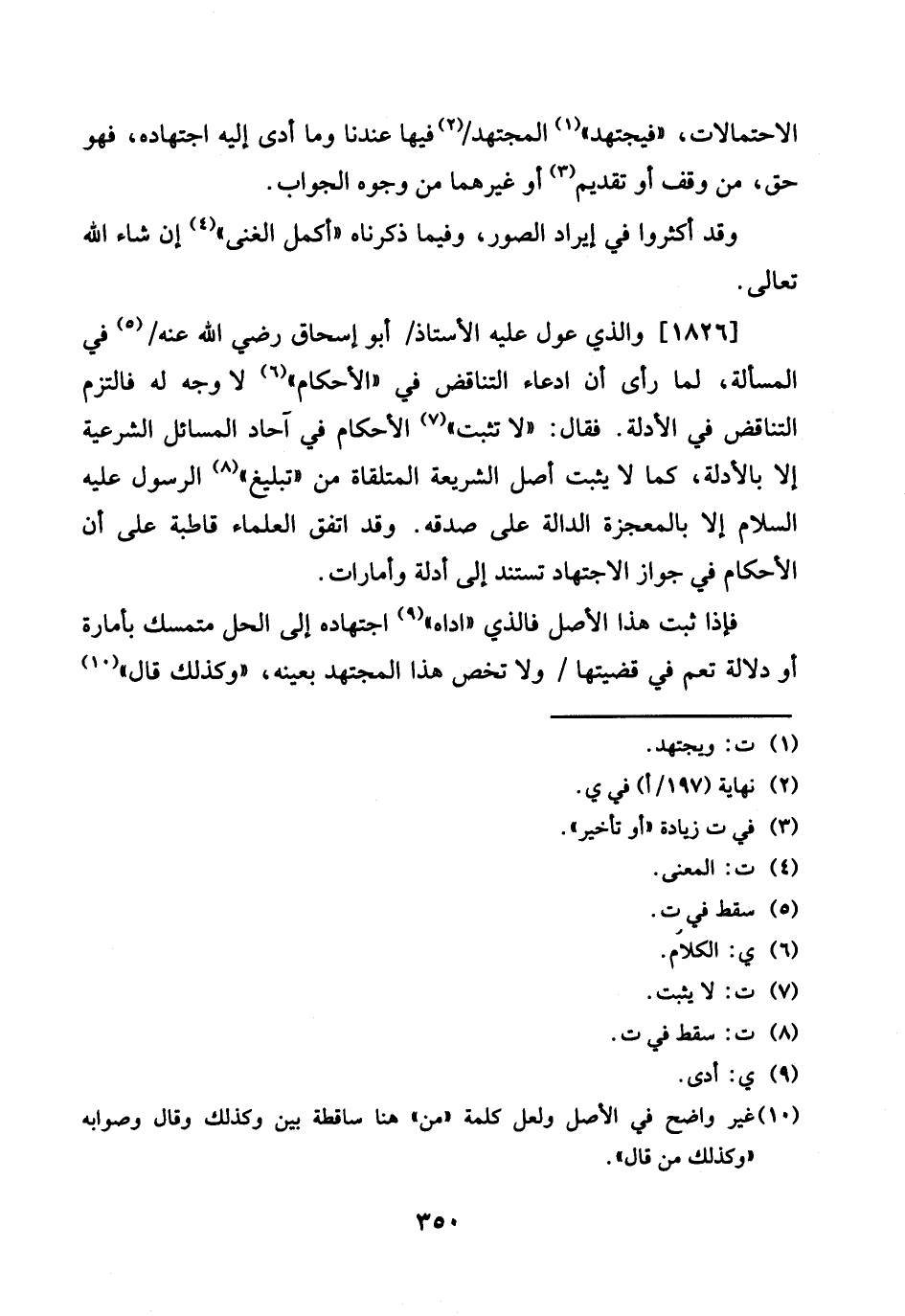1826 - وَالَّذِي عول عَلَيْهِ الْأُسْتَاذ / أَبُو إِسْحَاق رَضِي الله عَنهُ / فِي الْمَسْأَلَة، لما رأى أَن ادِّعَاء التَّنَاقُض فِي " الْأَحْكَام " لَا وَجه لَهُ فالتزم التَّنَاقُض فِي الْأَدِلَّة. فَقَالَ: " لَا تثبت " الْأَحْكَام فِي آحَاد الْمسَائِل الشَّرْعِيَّة إِلَّا بالأدلة، كَمَا لَا يثبت اصل الشَّرِيعَة المتلقاة من " تَبْلِيغ " الرَّسُول عَلَيْهِ السَّلَام إِلَّا بالمعجزة الدَّالَّة على صدقه. وَقد اتّفق الْعلمَاء قاطبة على أَن الْأَحْكَام فِي جَوَاز الِاجْتِهَاد تستند إِلَى أَدِلَّة وأمارات.