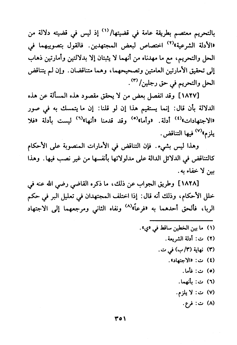 بِالتَّحْرِيمِ معتصم بطريقة عَامَّة فِي قضيتها / إِذْ لَيْسَ فِي قَضيته دلَالَة من " الْأَدِلَّة الشَّرْعِيَّة " اخْتِصَاص لبَعض الْمُجْتَهدين. فَالْقَوْل بتصويبهما فِي الْحل وَالتَّحْرِيم، مَعَ مَا مهدناه من أَنَّهُمَا لَا يثبتان إِلَّا بدلالتين وأمارتين ذهَاب إِلَى تَحْقِيق الأمارتين العامتين وتصحيحهما، وهما متناقضان. وَإِن لم يتناقض الْحل وَالتَّحْرِيم فِي حق رجلَيْنِ /.