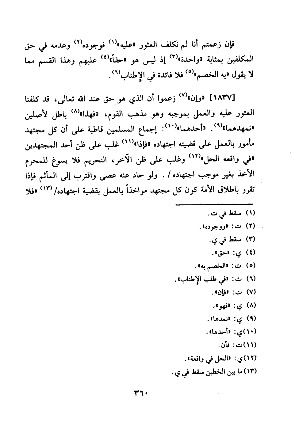 1837 - " وَإِن " زَعَمُوا أَن الَّذِي هُوَ عِنْد الله تَعَالَى، قد كلفنا العثور عَلَيْهِ وَالْعَمَل بِمُوجبِه وَهُوَ مَذْهَب الْقَوْم، " فَهَذَا " بَاطِل لأصلين " نمهدهما ". " أَحدهمَا ": إِجْمَاع الْمُسلمين قاطبة على أَن كل مُجْتَهد مَأْمُور بِالْعَمَلِ على قَضيته اجْتِهَاده " فَإِذا " غلب على ظن أحد الْمُجْتَهدين " فِي واقعه الْحل " وَغلب على ظن الآخر، التَّحْرِيم فَلَا يسوغ للْمحرمِ الْأَخْذ بِغَيْر مُوجب اجْتِهَاده /. وَلَو حاد عَنهُ عصى واقترب إِلَى المأثم فَإِذا تقرر باطلاق الْأمة كَون كل مُجْتَهد مواخذا بِالْعَمَلِ بقضية اجْتِهَاده / " فَلَا