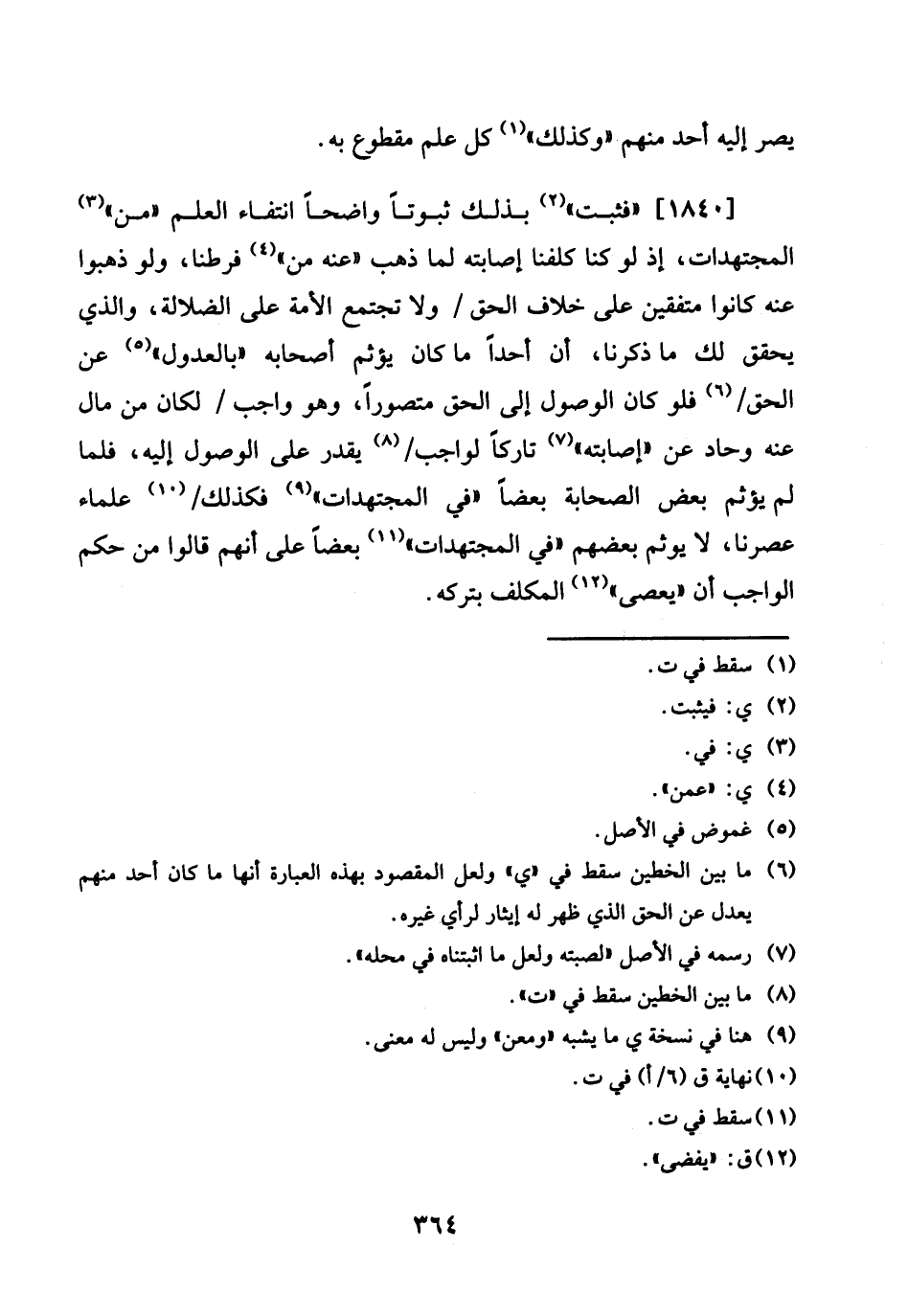 1840 - " فَثَبت " بذلك ثبوتا وَاضحا انْتِفَاء الْعلم " من " المجتهدات، إِذْ لَو كُنَّا كلفنا إِصَابَته لما ذهب " عَنهُ من " فرطنا، وَلَو ذَهَبُوا عَنهُ كَانُوا متفقين على خلاف الْحق / وَلَا تَجْتَمِع الْأمة على الضَّلَالَة، وَالَّذِي يُحَقّق لَك مَا ذكرنَا، أَن أحدا مَا كَانَ يؤثم أَصْحَابه " بالعدول " عَن الْحق / فَلَو كَانَ الْوُصُول إِلَى الْحق متصورا، وَهُوَ وَاجِب / لَكَانَ من مَال عَنهُ وحاد عَن " إِصَابَته " تَارِكًا لواجب / يقدر على الْوُصُول إِلَيْهِ، فَلَمَّا لم يؤثم بعض الصَّحَابَة بَعْضًا " فِي المجتهدات " فَكَذَلِك / عُلَمَاء عصرنا، لَا يوثم بَعضهم " فِي المجتهدات " بَعْضًا على أَنهم قَالُوا من حكم الْوَاجِب أَن " يعْصى " الْمُكَلف بِتَرْكِهِ.